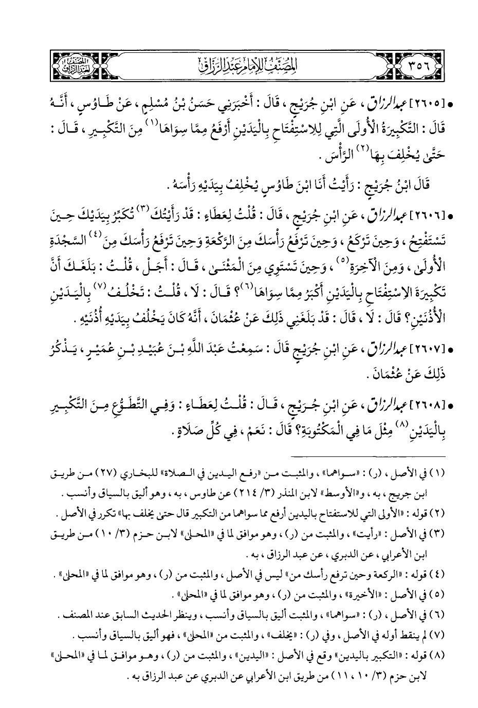 • [٢٦٠٦] عبد الرزاق، عَنِ ابْنِ جُرَيْجٍ، قَالَ: قُلْتُ لِعَطَاءٍ: قَدْ رَأَيْتُكَ (¬٣) تُكَبِّرُ بِيَدَيْكَ حِينَ تَسْتَفْتِحُ، وَحِينَ تَرْكَعُ، وَحِينَ تَرْفَعُ رَأْسَكَ مِنَ الرَّكْعَةِ وَحِينَ تَرْفَعُ رَأْسَكَ مِنَ (¬٤) السَّجْدَةِ الْأُولَى، وَمِنَ الْآخِرَةِ (¬٥)، وَحِينَ تَسْتَوِي مِنَ الْمَثْنَى، قَالَ: أَجَلْ، قُلْتْ: بَلَغَكَ أَنَّ تَكْبِيرَةَ الاسْتِفْتَاحِ بِالْيَدَيْنِ أَكْبَرُ مِمَّا سِوَاهَا (¬٦)؟ قَالَ: لَا، قُلْتُ: تَخْلُفُ (¬٧) بِالْيَدَيْنِ الْأُذُنَيْنِ؟ قَالَ: لَا، قَالَ: قَدْ بَلَغَنِي ذَلِكَ عَنْ عُثْمَانَ، أَنَّهُ كَانَ يَخْلُفُ بِيَدَيْهِ أُذُنَيْهِ.