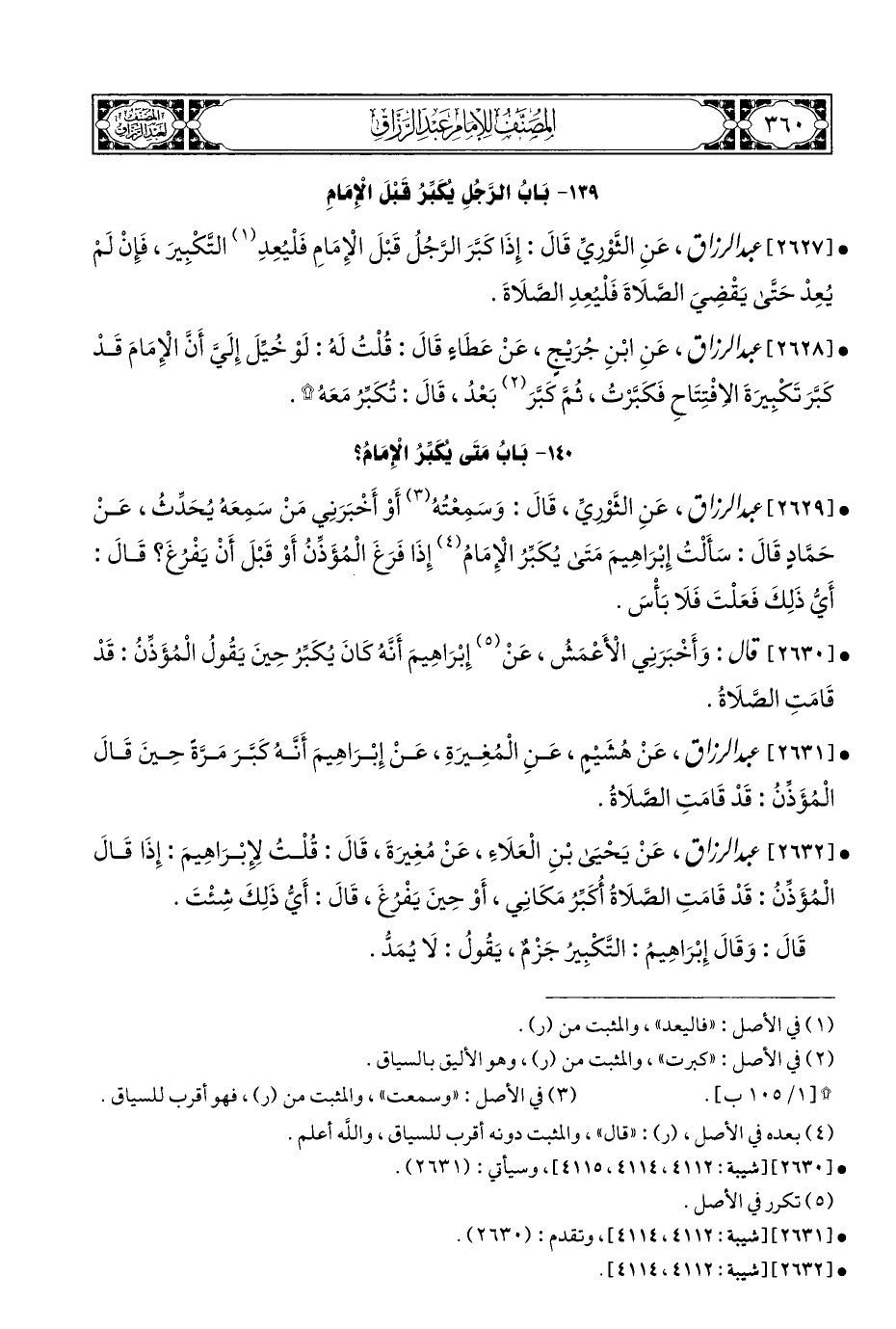 • [٢٦٢٩] عبد الرزاق، عَنِ الثوْرِيِّ، قَالَ: وَسَمِعْتُهُ (¬٣) أَوْ أَخْبَرَنِي مَنْ سَمِعَهُ يُحَدِّثُ، عَنْ حَمَّادٍ قَالَ: سَأَلْتُ إِبْرَاهِيمَ مَتَى يُكَبِّرُ الْإِمَامُ (¬٤) إِذَا فَرَغَ الْمُؤَذِّنُ أَوْ قَبْلَ أَنْ يَفْرُغَ؟ قَالَ: أَيُّ ذَلِكَ فَعَلْتَ فَلَا بَأْسَ.