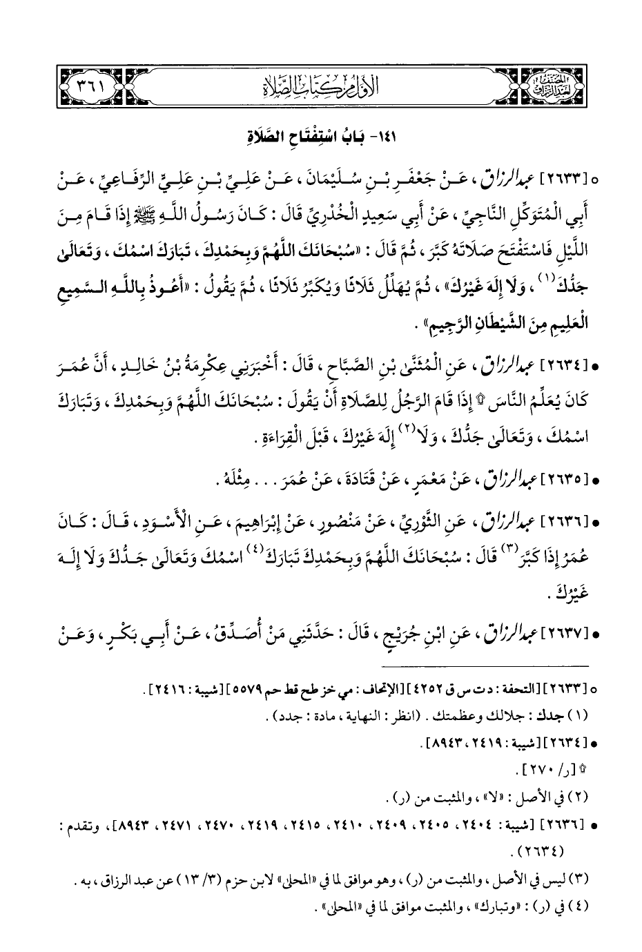 ° [٢٦٣٣] عبد الرزاق، عَنْ جَعْفَرِ بْنِ سُلَيْمَانَ، عَنْ عَلِي بْنِ عَلِيٍّ الرِّفَاعَيِّ، عَنْ أَبِي الْمُتَوَكِّلِ النَّاجِيِّ، عَنْ أَبِي سَعِيدٍ الْخُدْرِيِّ قَالَ: كَانَ رَسُولُ اللَّهِ - صلى الله عليه وسلم - إِذَا قَامَ مِنَ اللَّيْلِ فَاسْتَفْتَحَ صَلَاتَهُ كَبَّرَ، ثُمَّ قَالَ: "سُبْحَانَكَ اللَّهُمَّ وَبِحَمْدِكَ، تَبَارَكَ اسْمُكَ، وَتَعَالَى جَدُّكَ (¬١)، وَلَا إِلَهَ غَيْرُكَ"، ثُمَّ يُهَلِّلُ ثَلَاثًا وَيُكَبِّرُ ثَلَاثًا، ثُمَّ يَقُولُ: "أَعُوذُ بِاللَّهِ السَّمِيعِ الْعَلِيمِ مِنَ الشَّيْطَانِ الرَّجِيمِ".