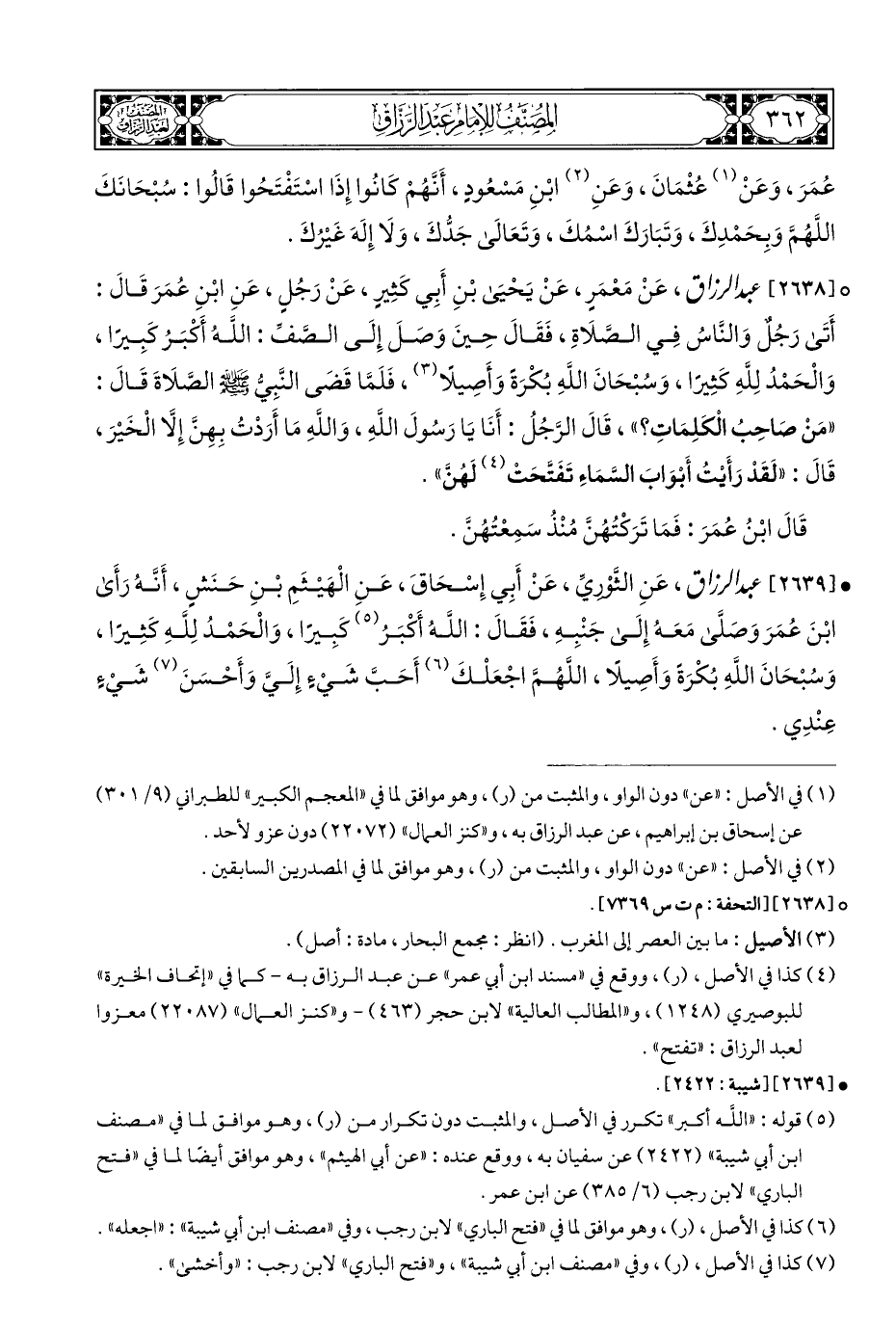 ° [٢٦٣٨] عبد الرزاق، عَنْ مَعْمَرٍ، عَنْ يَحْيَى بْنِ أَبِي كَثِيرٍ، عَنْ رَجُلٍ، عَنِ ابْنِ عُمَرَ قَالَ: أَتَى رَجُلٌ وَالنَّاسُ فِي الصَّلَاةِ، فَقَالَ حِينَ وَصَلَ إِلَى الصَّفِّ: اللَّهُ أَكْبَرُ كَبِيرًا، وَالْحَمْدُ للهِ كَثِيرًا، وَسُبْحَانَ اللَّهِ بُكْرَةً وَأَصِيلًا (¬٣)، فَلَمَّا قَضَى النَّبِيُّ - صلى الله عليه وسلم - الصَّلَاةَ قَالَ: "مَنْ صَاحِبُ الْكَلِمَاتِ؟ "، قَالَ الرَّجُلُ: أَنَا يَا رَسُولَ اللَّهِ، وَاللَّهِ مَا أَرَدْتُ بِهِنَّ إِلَّا الْخَيْرَ، قَالَ: "لَقَدْ رَأَيْتُ أَبْوَابَ السَّمَاءِ تَفَتَّحَتْ (¬٤) لَهُنَّ".