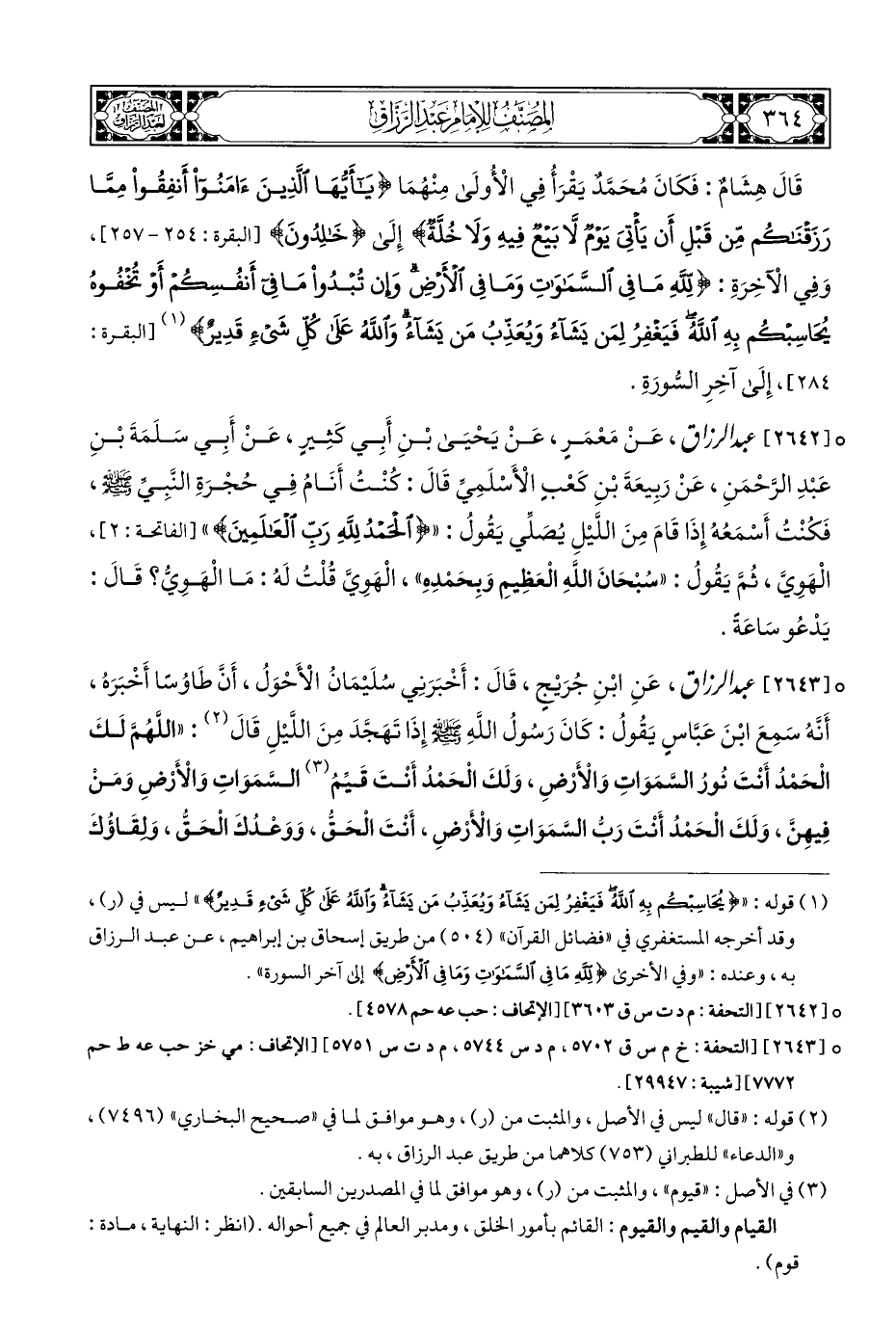 ° [٢٦٤٣] عبد الرزاق، عَنِ ابْنِ جُرَيْجٍ، قَالَ: أَخْبَرَنِي سُلَيْمَانُ الْأَحْوَلُ، أَنَّ طَاوُسًا أَخْبَرَهُ، أَنَّهُ سَمِعَ ابْنَ عَبَّاسٍ يَقُولُ: كَانَ رَسُولُ اللَّهِ - صلى الله عليه وسلم - إِذَا تَهَجَّدَ مِنَ اللَّيْلِ قَالَ (¬٢): "اللَّهُمَّ لَكَ الْحَمْدُ أَنْتَ نُورُ السَّمَوَاتِ وَالْأَرْضِ، وَلَكَ الْحَمْدُ أَنْتَ قَيِّمُ (¬٣) السَّمَوَاتِ وَالْأَرْضِ وَمَنْ فِيهِنَّ، وَلَكَ الْحَمْدُ أَنْتَ رَبُّ السَّمَوَاتِ وَالْأَرْضِ، أَنْتَ الْحَقُّ، وَوَعْدُكَ الْحَقُّ، وَلقَاؤُكَ