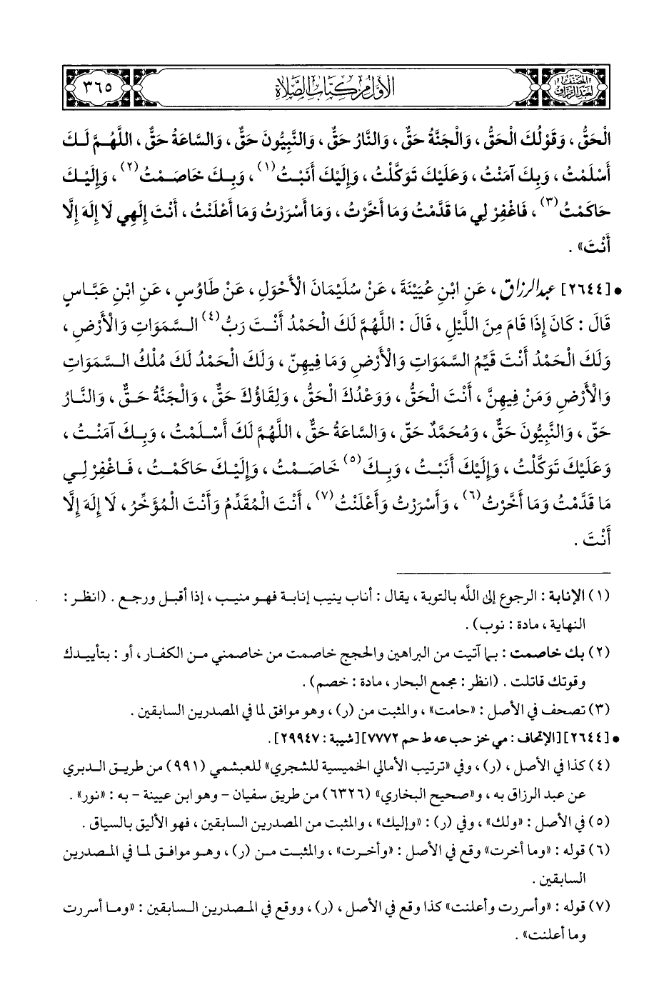 • ° [٢٦٤٤] عبد الرزاق، عَنِ ابْنِ عُيَيْنَةَ، عَنْ سُلَيْمَانَ الْأَحْوَلِ، عَنْ طَاوُسٍ، عَنِ ابْنِ عَبَّاسٍ قَالَ: كَانَ إِذَا قَامَ مِنَ اللَّيْلِ، قَالَ: اللَّهُمَّ لَكَ الْحَمْدُ أَنْتَ رَبُّ (¬٤) السَّمَوَاتِ وَالْأَرْضِ، وَلَكَ الْحَمْدُ أَنْتَ قَيِّمُ السَّمَوَاتِ وَالْأَرْضِ وَمَا فِيهِنّ، وَلَكَ الْحَمْدُ لَكَ مُلْكُ السَّمَوَاتِ وَالْأَرْضِ وَمَنْ فِيهِنَّ، أَنْتَ الْحَقُّ، وَوَعْدُكَ الْحَقُّ، وَلِقَاؤُكَ حَقٌّ، وَالْجَنَّةُ حَقٌّ، وَالنَّارُ حَقٌّ، وَالنَّبِيُّونَ حَقٌّ، وَمُحَمَّد حَقٌّ، وَالسَّاعَةُ حَقٌّ، اللَّهُمَّ لَكَ أَسْلَمْتُ، وَبِكَ آمَنْتُ، وَعَلَيْكَ تَوَكَّلْتُ، وِإلَيْكَ أَنَبْتُ، وَبِكَ (¬٥) خَاصَمْتُ، وَإِلَيْكَ حَاكَمْتُ، فَاغْفِرْ لِي مَا قَدَّمْتُ وَمَا أَخَّرْتُ (¬٦)، وَأَسْرَرْتُ وَأَعْلَنْتُ (¬٧)، أَنْتَ الْمُقَدِّمُ وَأَنْتَ الْمُؤَخِّرُ، لَا إِلَهَ إِلَّا أَنْتَ.