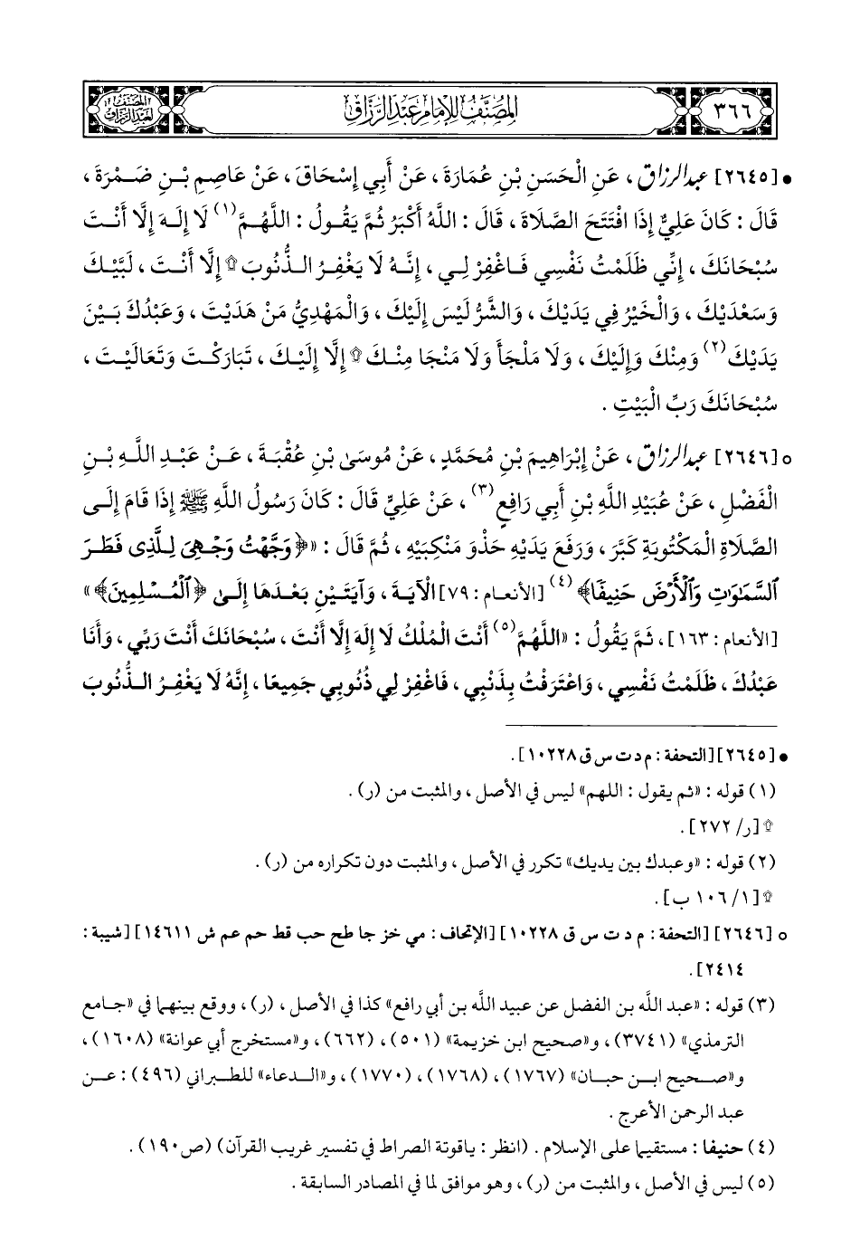 • [٢٦٤٥] عبد الرزاق، عَنِ الْحَسَنِ بْنِ عُمَارَةَ، عَنْ أَبِي إِسْحَاقَ، عَنْ عَاصِمِ بْنِ ضَمْرَةَ، قَالَ: كَانَ عَلِيٌّ إِذَا افْتَتَحَ الصَّلَاةَ، قَالَ: اللَّهُ أكبَرُ ثُمَّ يَقُولُ: اللَّهُمَّ (¬١) لَا إِلَهَ إِلَّا أَنْتَ سُبْحَانَكَ، إِنِّي ظَلَمْتُ نَفْسِي فَاغْفِرْ لِي، إِنَّهُ لَا يَغْفِرُ الذُّنُوبَ * إِلَّا أَنْتَ، لَبَّيْكَ وَسَعْدَيْكَ، وَالْخَيْرُ فِي يَدَيْكَ، وَالشَّرُّ لَيْسَ إِلَيْكَ، وَالْمَهْدِيُّ مَنْ هَدَيْتَ، وَعَبْدُكَ بَيْنَ يَدَيْكَ (¬٢) وَمِنْكَ وإلَيْكَ، وَلَا مَلْجَأَ وَلَا مَنْجَا مِنْكَ * إِلَّا إِلَيْكَ، تَبَارَكْتَ وَتَعَالَيْتَ، سُبْحَانَكَ رَبِّ الْبَيْتِ.