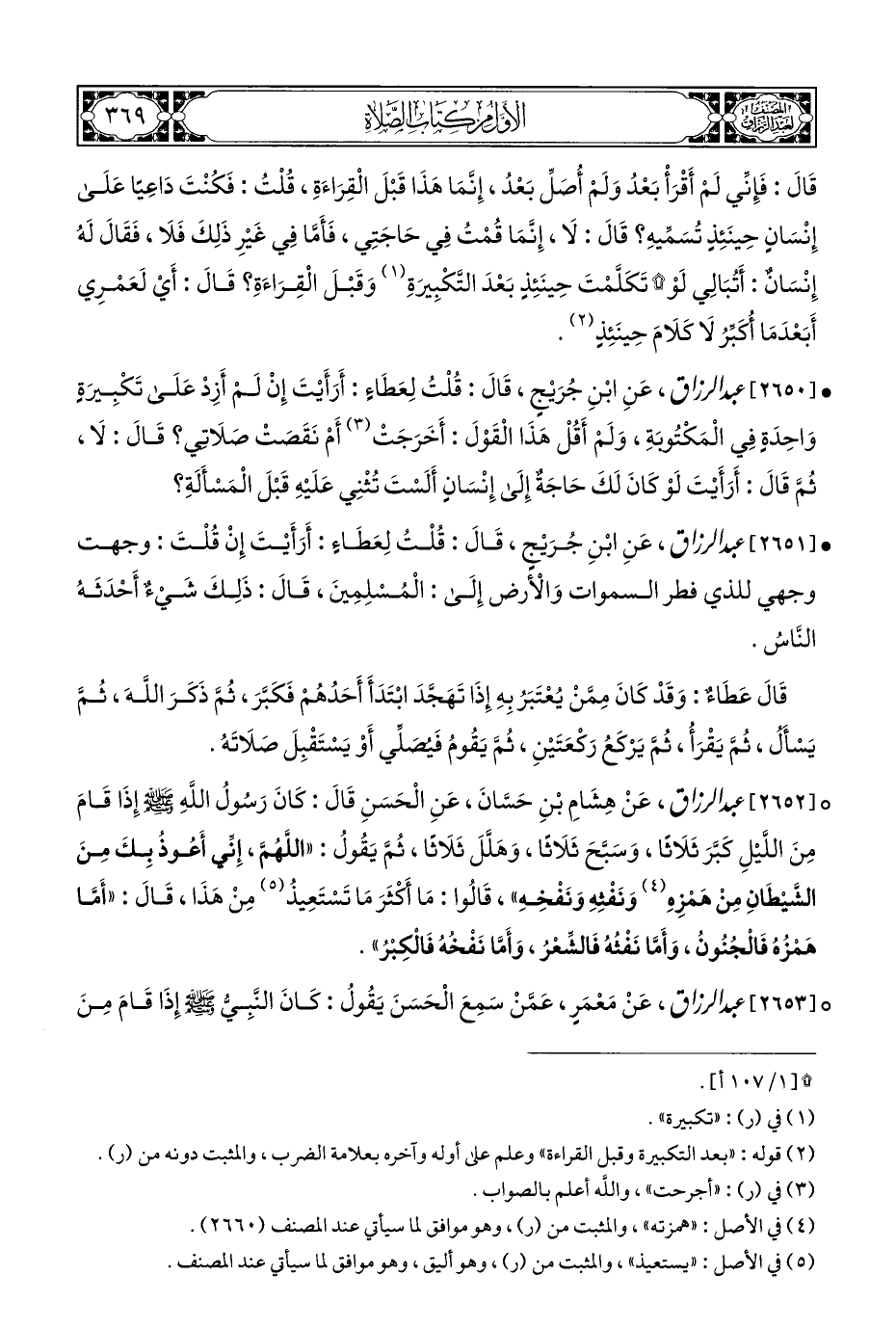 ° [٢٦٥٢] عبد الرزاق، عَنْ هِشَامِ بْنِ حَسَّانَ، عَنِ الْحَسَنِ قَالَ: كَانَ رَسُولُ اللَّهِ - صلى الله عليه وسلم - إِذَا قَامَ مِنَ اللَّيْلِ كَبَّرَ ثَلَاثًا، وَسَبَّحَ ثَلَاثًا، وَهَلَّلَ ثَلَاثًا، ثُمَّ يَقُولُ: "اللَّهُمَّ، إِنِّي أَعُوذُ بِكَ مِنَ الشَّيْطَانِ مِنْ هَمْزِهِ (¬٤) وَنَفْثِهِ وَنَفْخِهِ"، قَالُوا: مَا أَكْثَرَ مَا تَسْتَعِيذُ (¬٥) مِنْ هَذَا، قَالَ: "أَمَّا هَمْزُهُ فَالْجُنُونُ، وَأَمَّا نَفْثُهُ فَالشَّعْرُ، وَأَمَّا نَفْخُهُ فَالْكِبْرُ".