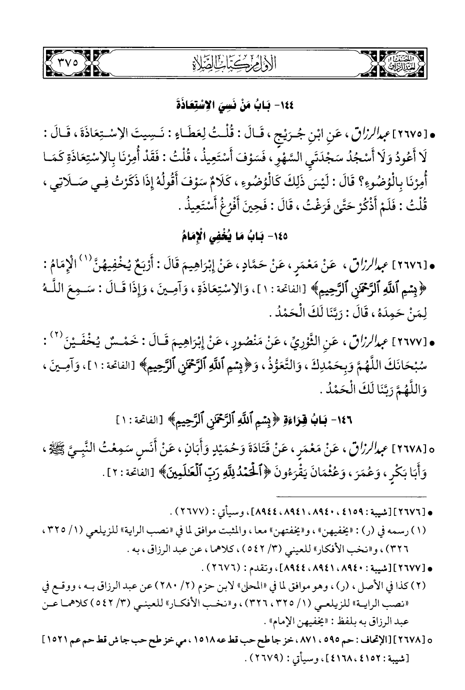 • [٢٦٧٧] عبد الرزاق، عَنِ الثَّوْرِيِّ، عَنْ مَنْصُورٍ، عَنْ إِبْرَاهِيمَ قَالَ: خَمْسٌ يُخْفَيْنَ (¬٢): سُبْحَانَكَ اللَّهُمَّ وَبِحَمْدِكَ، وَالتَّعَوُّذُ، وَ {بِسْمِ اللَّهِ الرَّحْمَنِ الرَّحِيمِ} [الفاتحة: ١]، وَآمِينَ، وَاللَّهُمَّ رَبَّنَا لَكَ الْحَمْدُ.