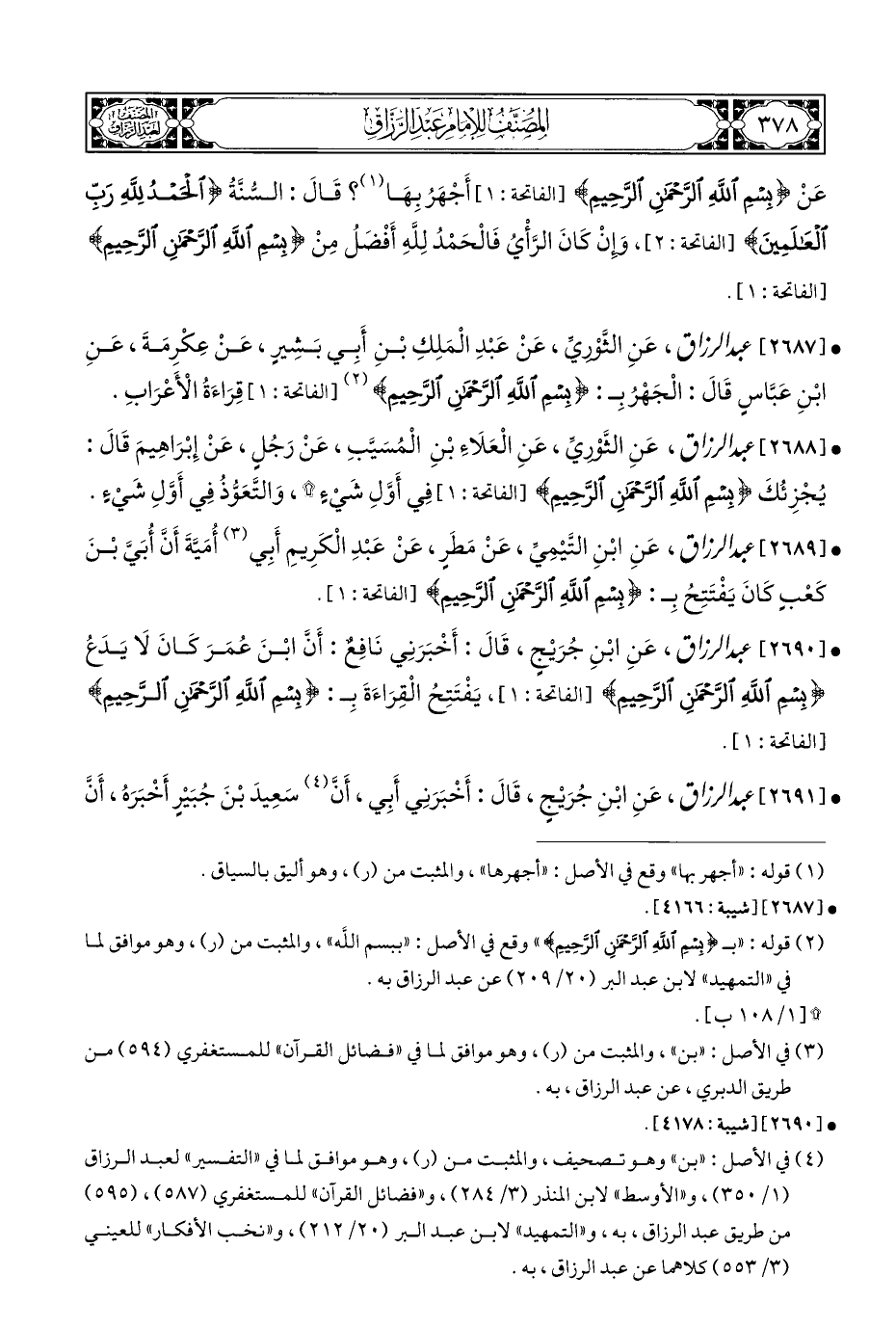 (¬٢) قوله: "بـ {بِسْمِ اللَّهِ الرَّحْمَنِ الرَّحِيمِ} " وقع في الأصل: "ببسم الله"، والمثبت من (ر)، وهو موافق لما في "التمهيد" لابن عبد البر (٢٠/ ٢٠٩) عن عبد الرزاق به.