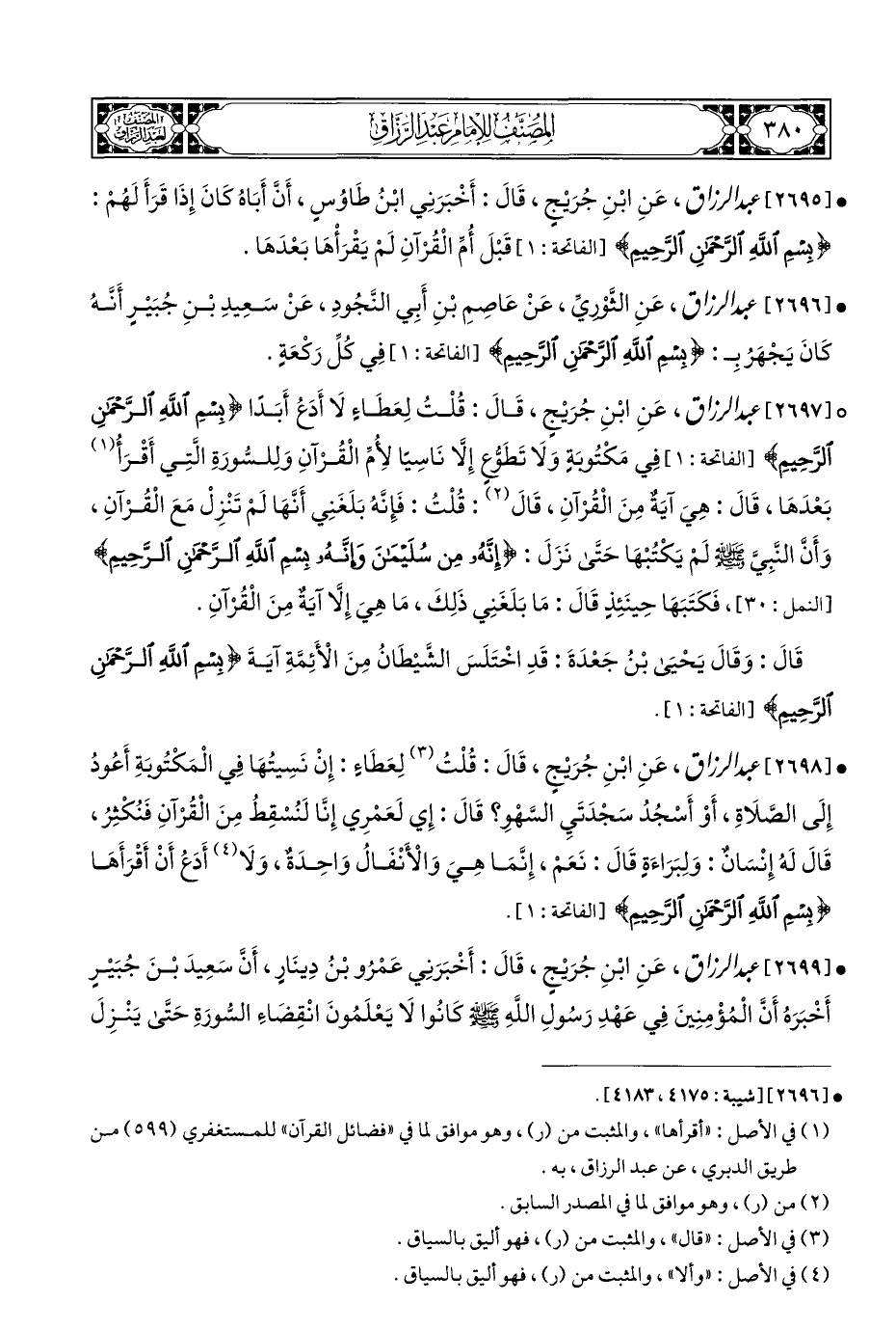 ° [٢٦٩٧] عبد الرزاق، عَنِ ابْنِ جُرَيْجٍ، قَالَ: قُلْتُ لِعَطَاءٍ لَا أَدَعُ أَبَدًا {بِسْمِ اللَّهِ الرَّحْمَنِ الرَّحِيمِ} [الفاتحة: ١]، فِي مَكْتُوبَةٍ وَلَا تَطَوُّعِ إِلَّا نَاسِيًا لِأُمِّ الْقُرْآنِ وَلِلسُّورَةِ الَّتِي أَقْرَأُ (¬١) بَعْدَهَا، قَالَ: هِيَ آيَة مِنَ الْقُرْآنِ، قَالَ (¬٢): قُلْتُ: فَإِنَّهُ بَلَغَنِي أَنَّهَا لَمْ تَنْزِلْ مَعَ الْقُرْآنِ، وَأَنَّ النَّبِيّ - صلى الله عليه وسلم - لَمْ يَكْتُبْهَا حَتى نَزَلَ: {إِنَّهُ مِنْ سُلَيْمَانَ وَإِنَّهُ بِسْمِ اللَّهِ الرَّحْمَنِ الرَّحِيمِ} [النمل: ٣٠]، فَكَتَبَهَا حِينَئِذٍ قَالَ: مَا بَلَغَنِي ذَلِكَ، مَا هِيَ إِلَّا آيَة مِنَ الْقُرْآنِ.