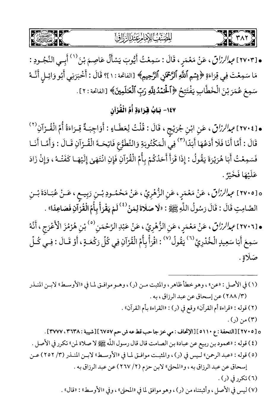 • [٢٧٠٤] عبد الرزاق، عَنِ ابْنِ جُرَيْجٍ، قَالَ: قُلْتُ لِعَطَاءٍ: أَوَاجِبَة قِرَاءَةُ أُمِّ الْقُرْآنِ (¬٢) قَالَ: أَمَّا أَنَا فَلَا أَدَعُهَا أَبَدًا (¬٣) فِي الْمَكْتُوبَةِ وَالتَّطَوُّعِ فَاتِحَةَ الْقُرْآنِ قَالَ: وَأَمَّا أَنَا فَسَمِعْتُ أَبَا هُرَيْرَةَ يَقُولُ: إِذَا قَرَأَ أَحَدُكُمْ بِأُمِّ الْقُرانِ فَإِنِ انْتَهَى إِلَيْهَا كَفَتْهُ، وَإِنْ زَادَ عَلَيْهَا فَخَيْرٌ.