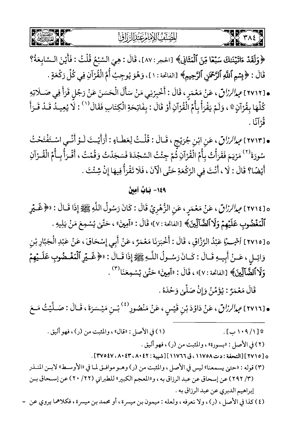 ° [٢٧١٤] عبد الرزاق، عَنْ مَعْمَرٍ، عَنِ الزُّهْرِيِّ قَالَ: كَانَ رَسُولُ اللَّهِ - صلى الله عليه وسلم - إِذَا قَالَ: " {غَيْرِ الْمَغْضُوبِ عَلَيْهِمْ وَلَا الضَّالِّينَ} [الفاتحة: ٧] " قَالَ: "آمِينَ"، حَتَّى يُسْمِعَ مَنْ يَلِيهِ.