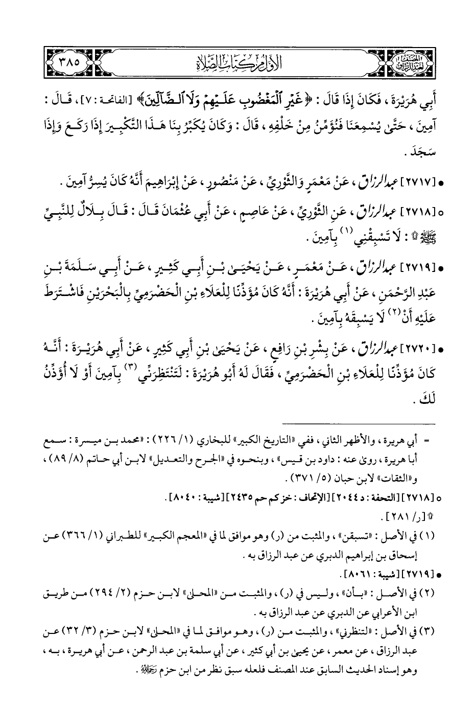 • [٢٧١٩] عبد الرزاق، عَنْ مَعْمَرٍ، عَنْ يَحْيَى بْنِ أَبِي كَثِيرٍ، عَنْ أَبِي سَلَمَةَ بْنِ عَبْدِ الرَّحْمَنِ، عَنْ أَبِي هُرَيْرَةَ: أَنَّهُ كَانَ مُؤَذِّنًا لِلْعَلَاءِ بْنِ الْحَضْرَمِيِّ بِالْبَحْرَيْنِ فَاشْتَرَطَ عَلَيْهِ أَنْ (¬٢) لَا يَسْبِقَهُ بِآمِينَ.