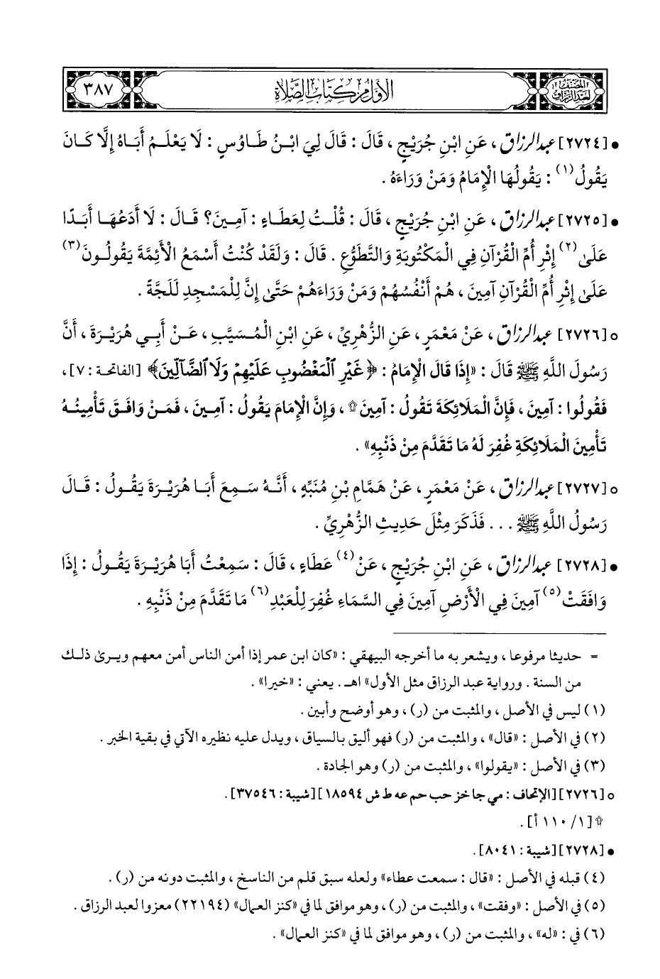 • [٢٧٢٥] عبد الرزاق، عَنِ ابْنِ جُرَيْجٍ، قَالَ: قُلْتُ لِعَطَاءٍ: آمِينَ؟ قَالَ: لَا أَدَعُهَا أَبَدًا عَلَى (¬٢) إِثْرِ أُمِّ الْقُرْآنِ فِي الْمَكْتُوبَةِ وَالتَّطَوُّعِ. قَالَ: وَلَقَدْ كُنْتُ أَسْمَعُ الْأَئِمَّةَ يَقُولُونَ (¬٣) عَلَى إِثْرِ أُمِّ الْقُرْآنِ آمِينَ، هُمْ أَنْفُسُهُمْ وَمَنْ وَرَاءَهُمْ حَتَّى إِنَّ لِلْمَسْجِدِ لَلَجِّةَ.