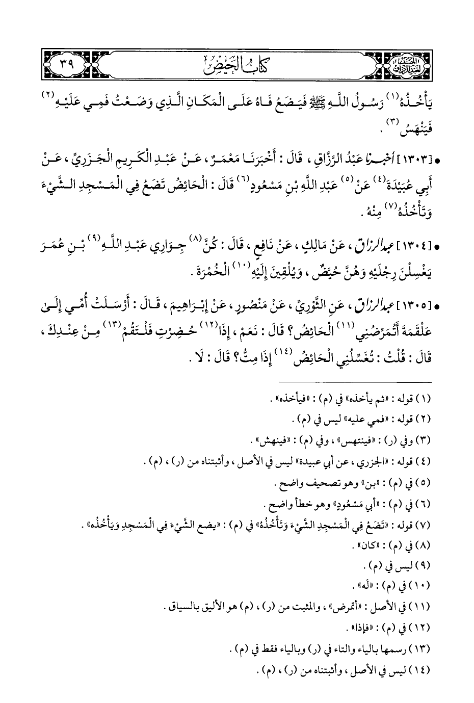 • [١٣٠٣] أخبرنا عَبْدُ الرَّزَّاقِ، قَالَ: أَخْبَرَنَا مَعْمَرٌ، عَن عَبْدِ الْكَرِيمِ الْجَزَرِيِّ، عَنْ أَبِي عُبَيْدَةَ (¬٤) عَنْ (¬٥) عَبْدِ اللَّهِ بْنِ مَسْعُودٍ (¬٦) قَالَ: الْحَائِضُ تَضَعُ فِي الْمَسْجِدِ الشَّيْءَ وَتَأْخُذُهُ (¬٧) مِنْهُ.