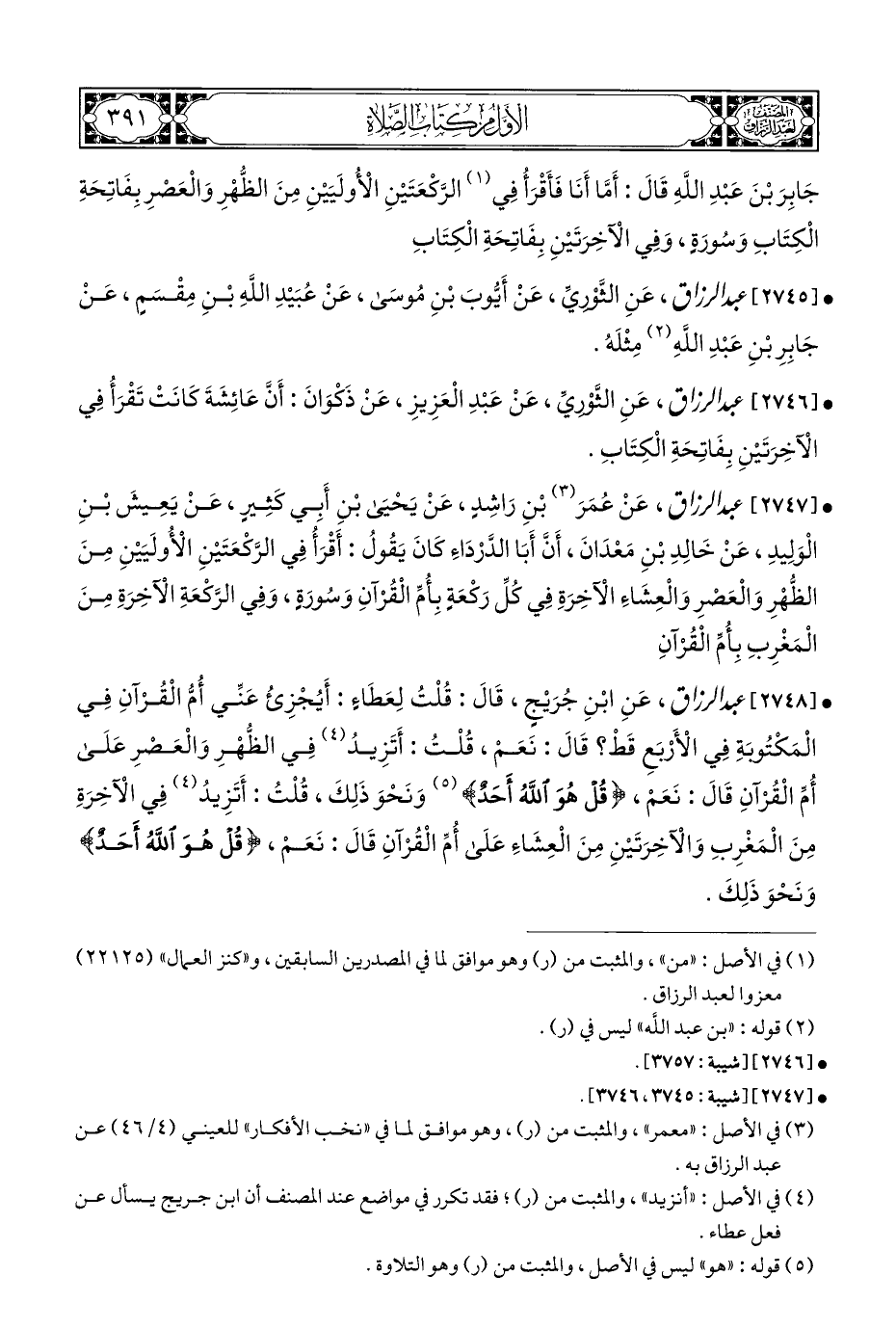 • [٢٧٤٧] عبد الرزاق، عَنْ عُمَرَ (¬٣) بْنِ رَاشِدٍ، عَنْ يَحْيَى بْنِ أَبِي كَثِيرٍ، عَنْ يَعِيشَ بْنِ الْوَلِيدِ، عَنْ خَالِدِ بْنِ مَعْدَانَ، أَنَّ أَبَا الدَّرْدَاءِ كَانَ يَقُولُ: أَقْرَأُ فِي الرَّكْعَتَيْنِ الأُولَيَيْنِ مِنَ الظُّهْرِ وَالْعَصْرِ وَالْعِشَاءِ الْآخِرَةِ فِي كُلِّ رَكْعَةٍ بِأُمِّ الْقُرْآنِ وَسُورَةٍ، وَفِي الرَّكْعَةِ الْآخِرَةِ مِنَ الْمَغْرِبِ بِأُمِّ الْقُرْآنِ.