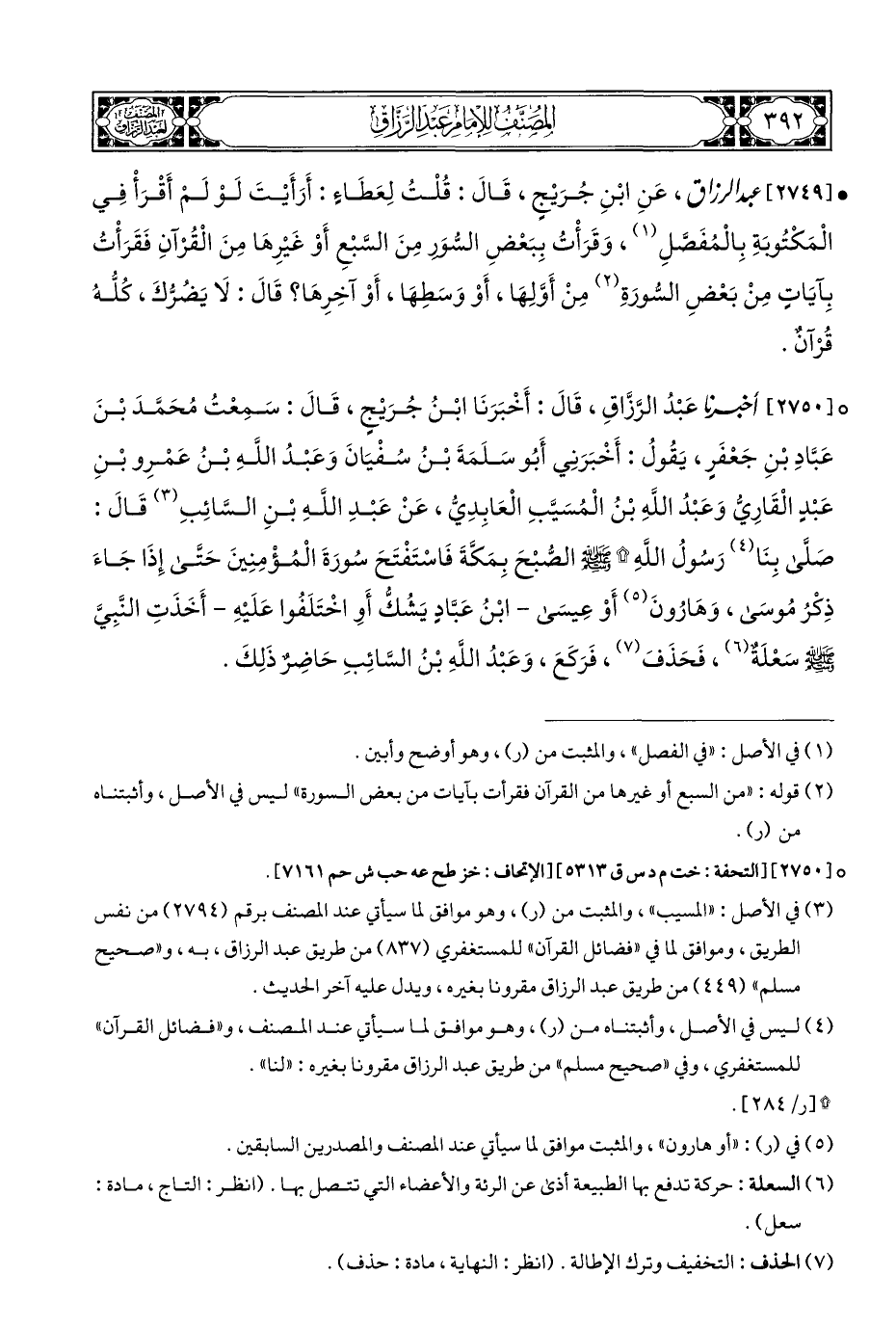 ° [٢٧٥٠] أَخْبَرَنَا عَبْدُ الرَّزَّاقِ، قَالَ: أَخْبَرَنَا ابْنُ جُرَيْجٍ، قَالَ: سَمِعْتُ مُحَمَّدَ بْنَ عَبَّادِ بْنِ جَعْفَرٍ، يَقُولُ: أَخْبَرَنِي أَبُو سَلَمَةَ بْنُ سُفْيَانَ وَعَبْدُ اللَّهِ بْنُ عَمْرِو بْنِ عَبْدٍ الْقَارِيُّ وَعَبْدُ اللَّهِ بْنُ الْمُسَيَّبِ الْعَابِدِيّ، عَنْ عَبْدِ اللَّهِ بْنِ السَّائِبِ (¬٣) قَالَ: صَلَّى بِنَا (¬٤) رَسُولُ اللَّهِ * - صلى الله عليه وسلم - الصُّبْحَ بِمَكَّةَ فَاسْتَفْتَحَ سُورَةَ الْمُؤْمِنِينَ حَتَّى إِذَا جَاءَ ذِكْرُ مُوسَى، وَهَارُونَ (¬٥) أَوْ عَيسَى - ابْنُ عَبَّادٍ يَشُكُّ أَوِ اخْتَلَفُوا عَلَيْهِ - أَخَذَتِ النَّبِيَّ - صلى الله عليه وسلم - سَعْلَةٌ (¬٦)، فَحَذَفَ (¬٧)، فَرَكَعَ، وَعَبْدُ اللَّهِ بْنُ السَّائِبِ حَاضِرٌ ذَلِكَ.