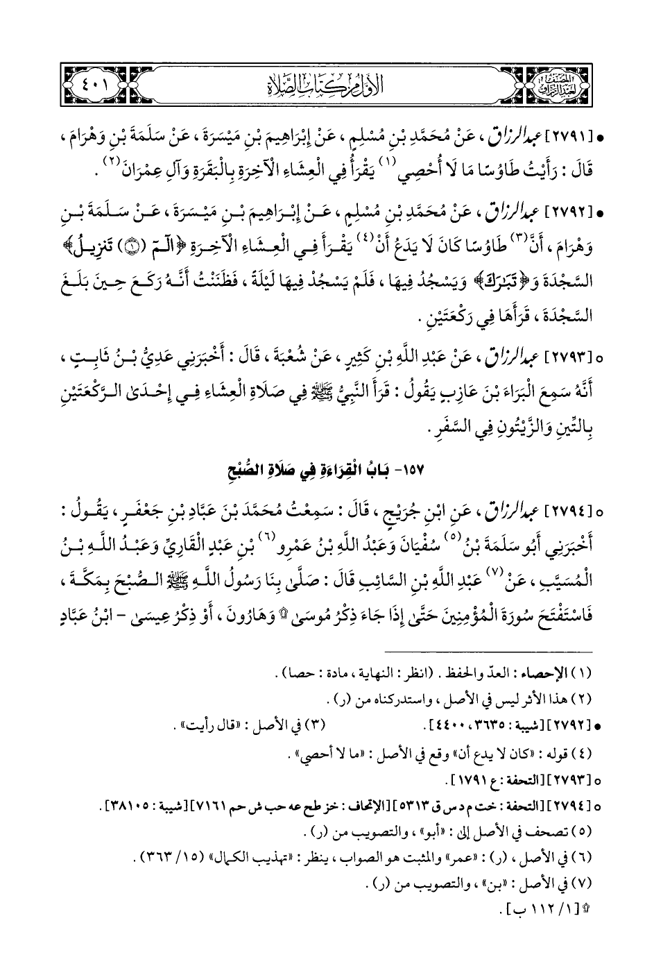 ° [٢٧٩٣] عبد الرزاق، عَنْ عَبْدِ اللهِ بْنِ كَثِيرٍ، عَنْ شُعْبَةَ، قَالَ: أَخْبَرَنِي عَدِيُّ بْنُ ثَابِتٍ، أَنَّهُ سَمِعَ الْبَرَاءَ بْنَ عَازِبٍ يَقُولُ: قَرَأَ النَّبِيُّ - صلى الله عليه وسلم - فِي صَلَاةِ الْعِشَاءَ فِي إِحْدَى الرَّكْعَتَيْنِ بِالتّينِ وَالزَّيْتُونِ فِي السَّفَرِ.