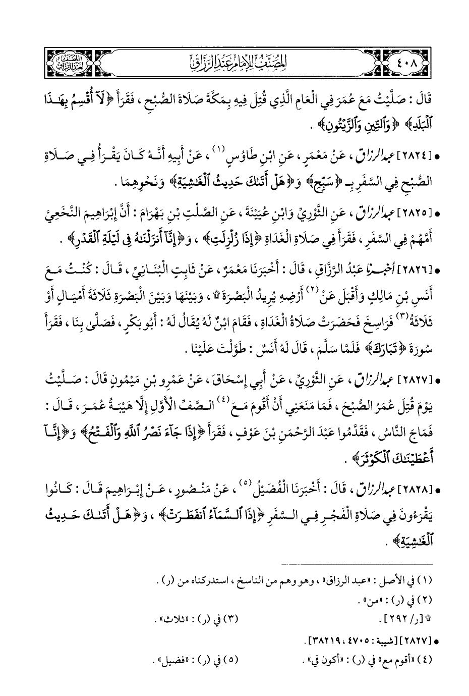 • [٢٨٢٨] عبد الرزاق، قَالَ: أَخْبَرَنَا الْفُضَيْلُ (¬٥)، عَنْ مَنْصُورٍ، عَنْ إِبْرَاهِيمَ قَالَ: كَانُوا يَقْرَءُونَ فِي صَلَاةِ الْفَجْرِ فِي السَّفَرِ {إِذَا السَّمَاءُ انْفَطَرَتْ}، وَ {هَلْ أَتَاكَ حَدِيثُ الْغَاشِيَةِ}.