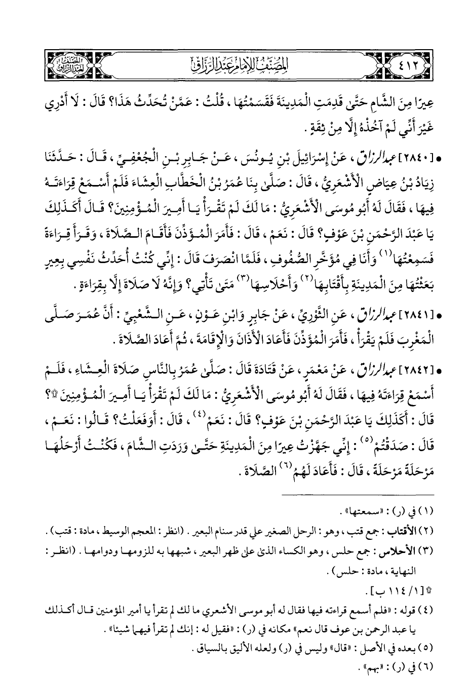 • [٢٨٤٢] عبد الرزاق، عَنْ مَعْمَرٍ، عَنْ قَتَادَةَ قَالَ: صَلَّى عُمَرُ بِالنَّاسِ صَلَاةَ الْعِشَاءَ، فَلَمْ أَسْمَعْ قِرَاءَتَهُ فِيهَا، فَقَالَ لَهُ أَبُو مُوسَى الْأَشْعَرِيُّ: مَا لَكَ لَمْ تَقْرَأْ يَا أَمِيرَ الْمُؤْمِنِينَ *؟ قَالَ: أَكَذَلِكَ يَا عَبْدَ الرَّحْمَنِ بْنَ عَوْفٍ؟ قَالَ: نَعَمْ (¬٤)، قَالَ: أَوَفَعَلْتُ؟ قَالُوا: نَعَمْ، قَالَ: صَدَقْتُمْ (¬٥): إِنِّي جَهَّزْتُ عِيرًا مِنَ الْمَدِينَةِ حَتَّى وَرَدَتِ الشَّامَ، فَكُنْتُ أَرْحَلُهَا مَرْحَلَةً مَرْحَلَةً، قَالَ: فَأَعَادَ لَهُمُ (¬٦) الصَّلَاةَ.