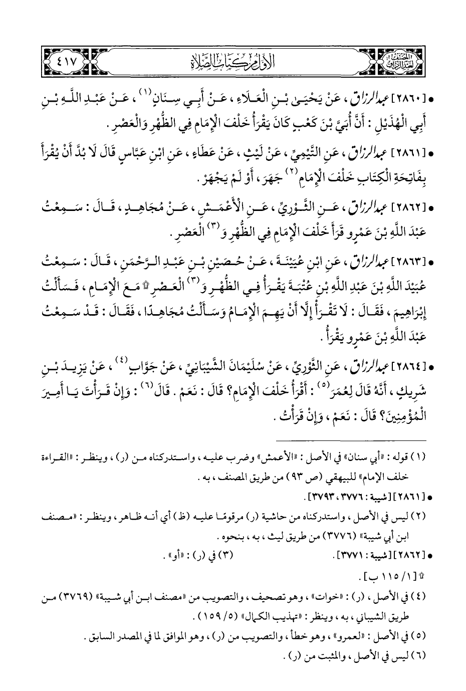 • [٢٨٦٣] عبد الرزاق، عَنِ ابْنِ عُيَيْنَةَ، عَنْ حُصَيْنِ بْنِ عَبْدِ الرَّحْمَنِ، قَالَ: سَمِعْتُ عُبَيْدَ اللهِ بْنَ عَبْدِ اللهِ بْنِ عُتْبَةَ يَقْرَأُ فِي الظُّهْرِ وَ (¬٣) الْعَصْرِ * مَعَ الْإِمَامِ، فَسَأَلْتُ إِبْرَاهِيمَ، فَقَالَ: لَا تَقْرَأْ إِلَّا أَنْ يَهِمَ الْإِمَامُ وَسَأَلْتُ مُجَاهِدًا، فَقَالَ: قَدْ سَمِعْتُ عَبْدَ اللهِ بْنَ عَمْرٍو يَقْرَأُ.