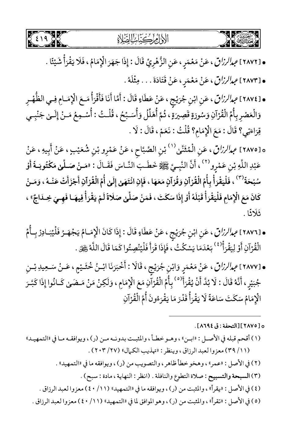 (¬٥) في الأصل: "تقرأ"، والمثبت من (ر)، وهو الموافق لما في "التمهيد" (١١/ ٤٠) معزوا لعبد الرزاق.