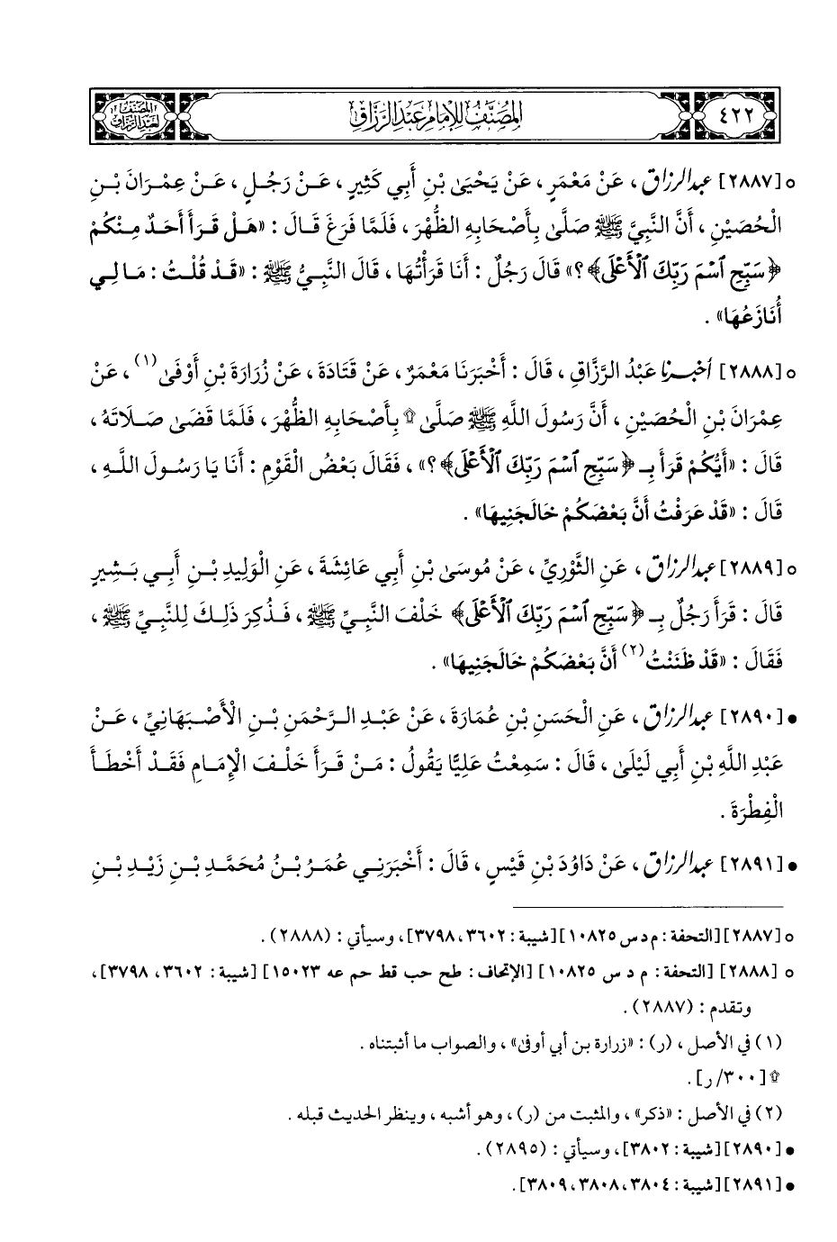 ° [٢٨٨٨] عَبْدُ الرَّزَّاقِ، قَالَ: أَخْبَرَنَا مَعْمَرٌ، عَنْ قَتَادَةَ، عَنْ زُرَارَةَ بْنِ أَوْفَى (¬١)، عَنْ عِمْرَانَ بْنِ الْحُصيْنِ، أَنَّ رَسُولَ اللهِ - صلى الله عليه وسلم - صَلَّى * بِأَصْحَابِهِ الظُّهْرَ، فَلَمَّا قَضَى صَلَاتَهُ، قَالَ: "أَيُّكُمْ قَرَأَ بِـ {سَبِّحِ اسْمَ رَبِّكَ الْأَعْلَى}؟ "، فَقَالَ بَعْضُ الْقَوْمِ: أَنَا يَا رَسُولَ اللهِ، قَالَ: "قَدْ عَرَفْتُ أَنَّ بَعْضَكُمْ خَالَجَنِيهَا".