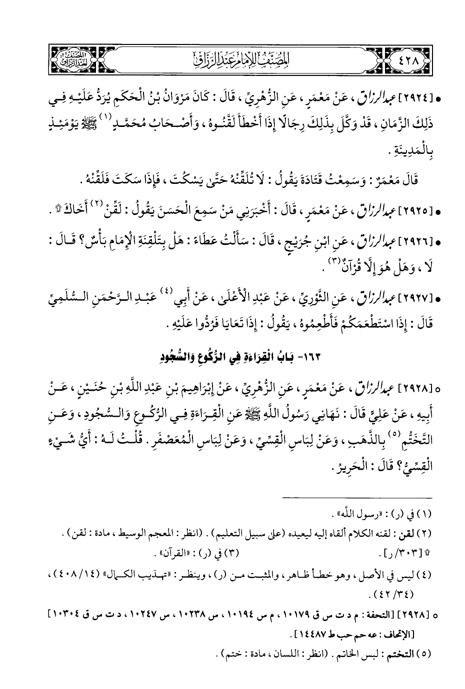 ° [٢٩٢٨] عبد الزراق، عَنْ مَعْمَرٍ، عَنِ الزُّهْرِيِّ، عَنْ إِبْرَاهِيمَ بْنِ عَبْدِ اللهِ بْنِ حُنَيْنٍ، عَنْ أَبِيهِ، عَنْ عَلِيٍّ قَالَ: نَهَانِي رَسُولُ اللهِ - صلى الله عليه وسلم - عَنِ الْقِرَاءَةِ فِي الرُّكُوعِ وَالسُّجُودِ، وَعَنِ التَّخَتُّمِ (¬٥) بِالذَّهَبِ، وَعَنْ لِبَاسِ الْقِسِّيِّ، وَعَنْ لِبَاسِ الْمُعَصْفَرِ. قُلْتُ لَهُ: أَيُّ شَيءٍ الْقِسِّيُّ؟ قَالَ: الْحَرِيرُ.