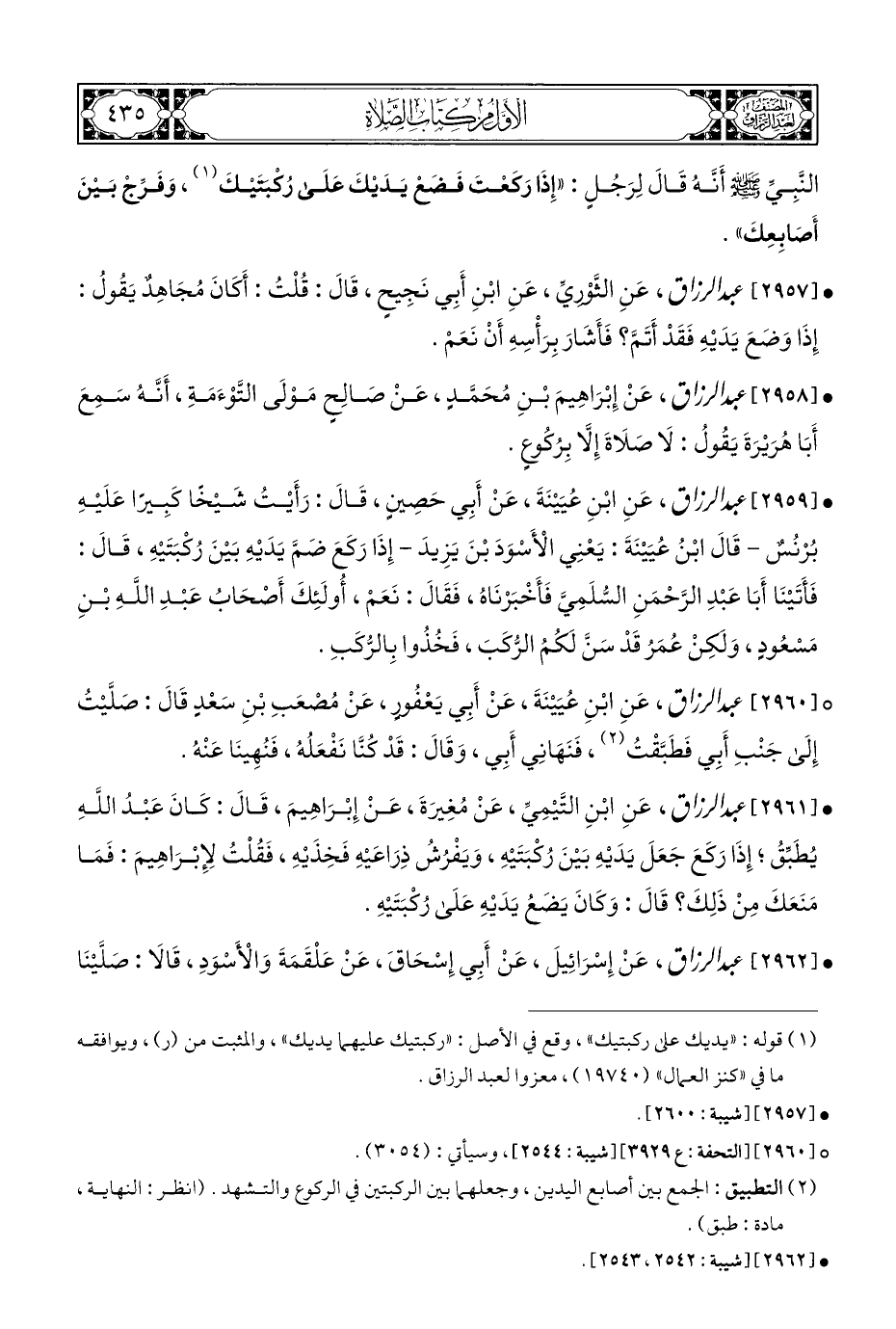 • [٢٩٦١] عبد الرزاق، عَنِ ابْنِ التَّيْمِيِّ، عَنْ مُغِيرَةَ، عَنْ إِبْرَاهِيمَ، قَالَ: كَانَ عَبْدُ اللهِ يُطَبِّقُ؟ إِذَا رَكَعَ جَعَلَ يَدَيْهِ بَيْنَ رُكْبَتَيْهِ، وَيَفْرُشُ ذِرَاعَيْهِ فَخِذَيْهِ، فَقُلْتُ لإِبْرَاهِيمَ: فَمَا مَنَعَكَ مِنْ ذَلِكَ؟ قَالَ: وَكَانَ يَضَعُ يَدَيْهِ عَلَى رُكْبَتَيْهِ.