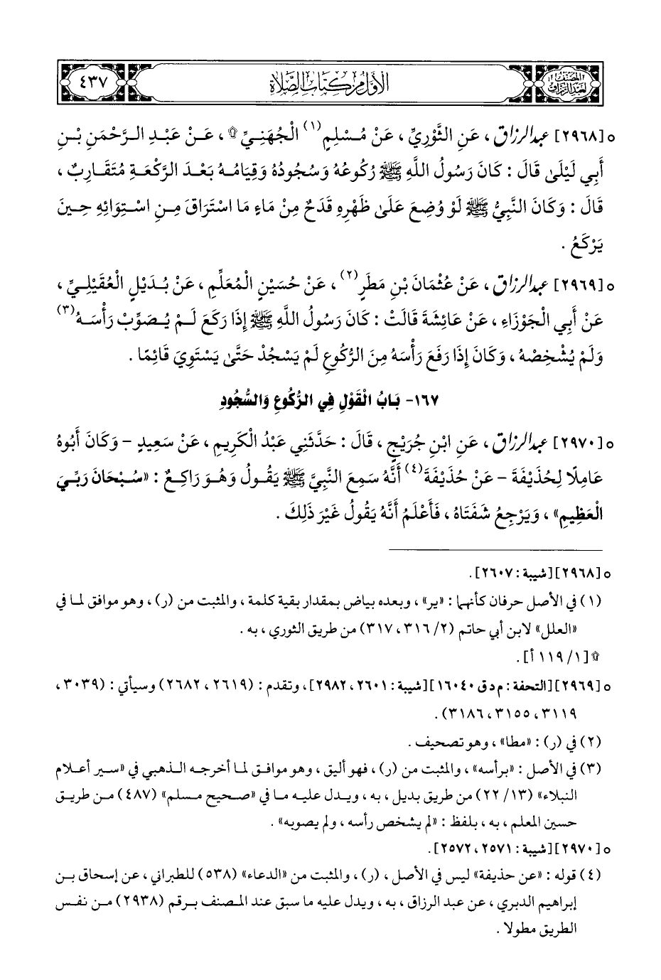 ° [٢٩٦٩] عبد الرزاق، عَنْ عُثْمَانَ بْنِ مَطَرٍ (¬٢)، عَنْ حُسَيْنٍ الْمُعَلِّمِ، عَنْ بُدَيْلٍ الْعُقَيْلِي، عَنْ أَبِي الْجَوْزَاءِ، عَنْ عَائِشَةَ قَالَتْ: كَانَ رَسُولُ اللهِ - صلى الله عليه وسلم - إِذَا رَكَعَ لَمْ يُصَوِّبْ رَأْسَهُ (¬٣) وَلَمْ يُشْخِصْهُ، وَكَانَ إِذَا رَفَعَ رَأْسَهُ مِنَ الرُّكُوعِ لَمْ يَسْجُدْ حَتَى يَسْتَوِيَ قَائِمًا.