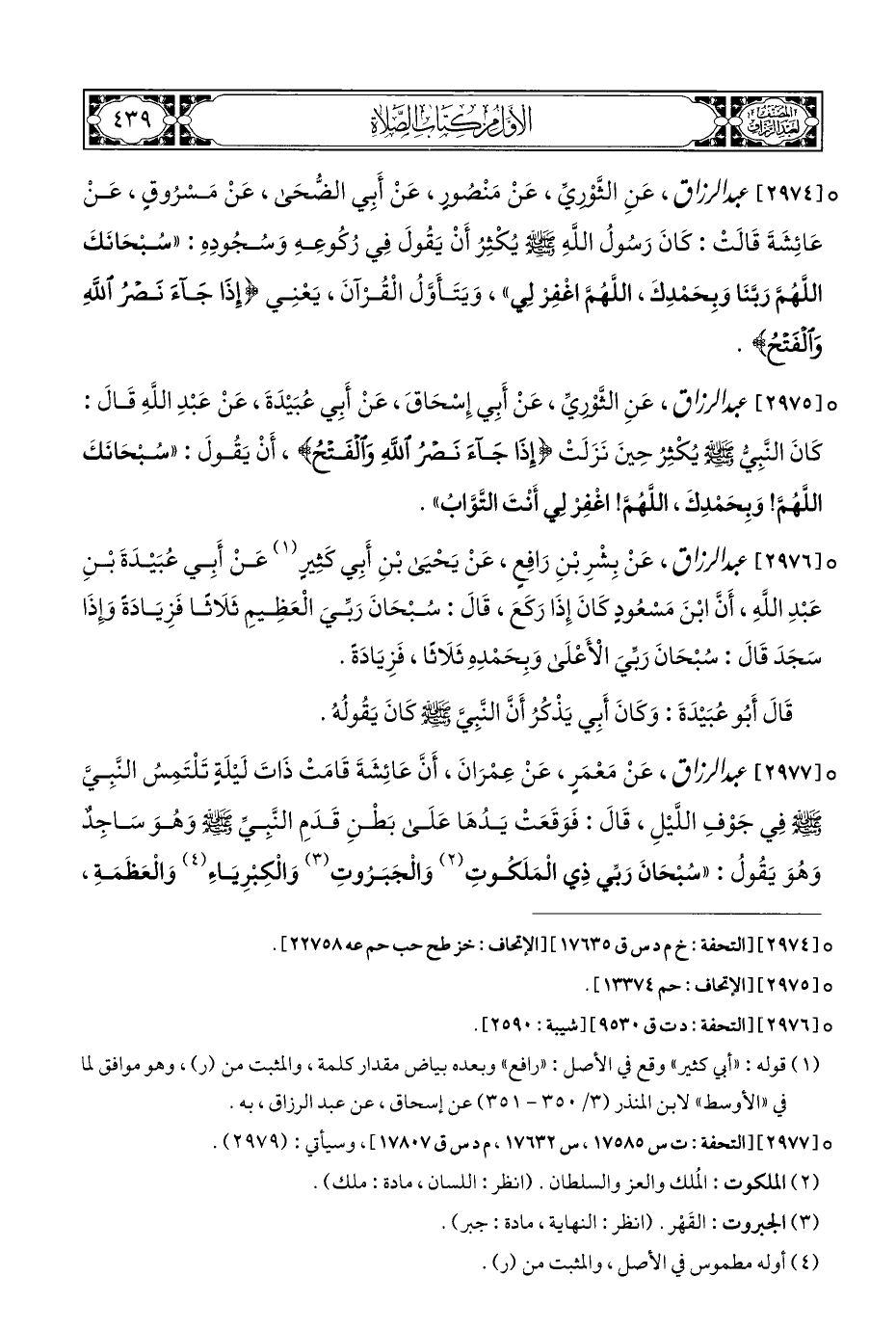 ° [٢٩٧٤] عبد الرزاق، عَنِ الثَّوْرِيِّ، عَنْ مَنْصُورٍ، عَنْ أَبِي الضُّحَى، عَنْ مَسْرُوقٍ، عَنْ عَائِشَةَ قَالَتْ: كَانَ رَسُولُ اللهِ - صلى الله عليه وسلم - يكْثِرُ أَنْ يَقُولَ فِي رُكُوعِهِ وَسُجُودِهِ: "سُبْحَانَكَ اللَّهُمَّ رَبَّنَا وَبِحَمْدِكَ، اللَّهُمَّ اغْفِرْ لِي"، وَيَتَأَوَّلُ الْقُرْآنَ، يَعْنِي {إِذَا جَاءَ نَصْرُ اللَّهِ وَالْفَتْحُ}.