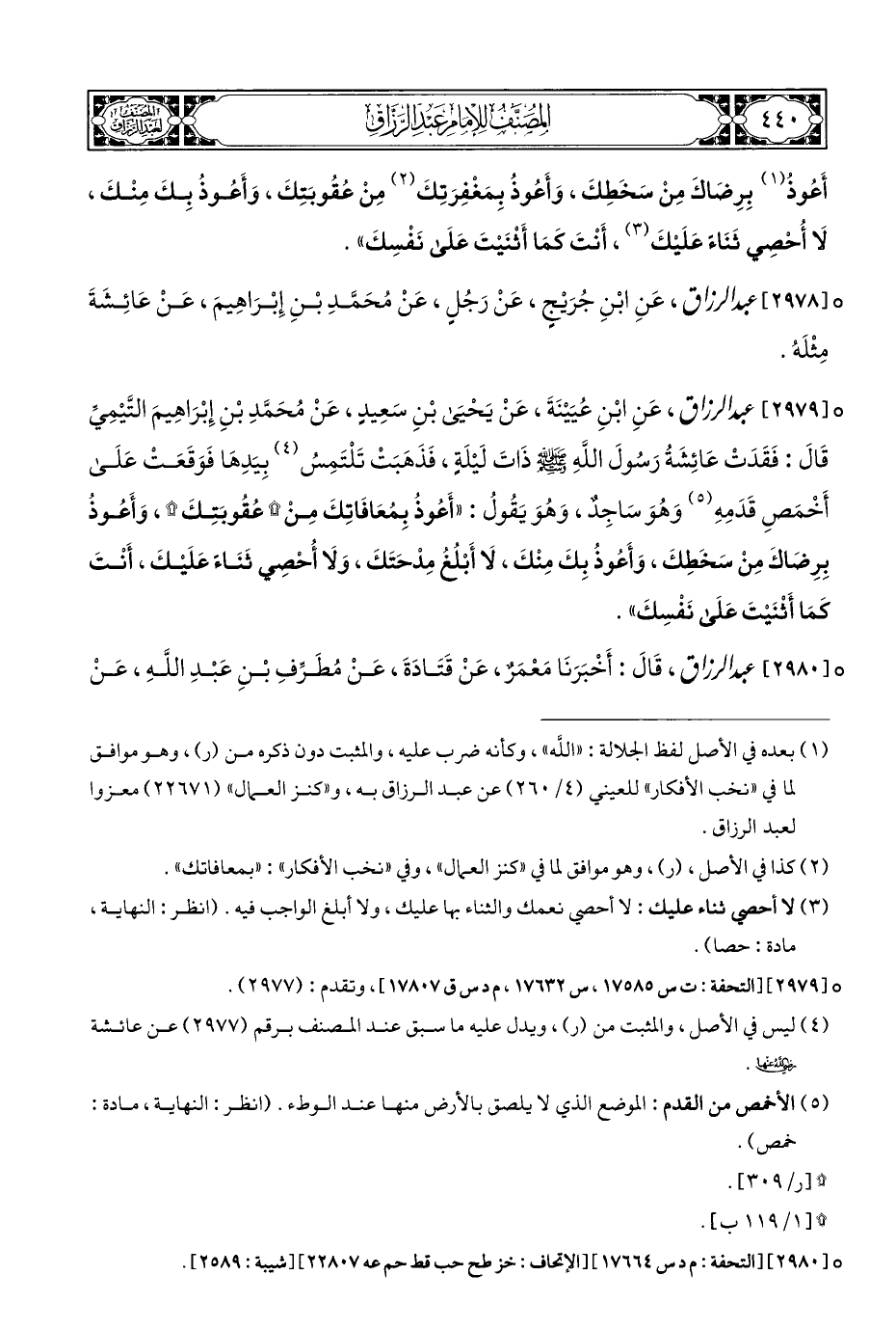 ° [٢٩٧٩] عبد الرزاق، عَنِ ابْنِ عُيَيْنَةَ، عَنْ يَحْيَى بْنِ سَعِيدٍ، عَنْ مُحَمَّدِ بْنِ إِبْرَاهِيمَ التَّيْمِيِّ قَالَ: فَقَدَتْ عَائِشَةُ رَسُولَ اللهِ - صلى الله عليه وسلم - ذاتَ لَيْلَةٍ، فَذَهَبَتْ تَلْتَمِسُ (¬٤) بِيَدِهَا فَوَقَعَتْ عَلَى أَخْمَصِ قَدَمِهِ (¬٥) وَهُوَ سَاجِدٌ، وَهُوَ يَقُولُ: "أَعُوذُ بِمُعَافَاتِكَ مِنْ * عُقُوبَتِكَ *، وَأَعُوذُ بِرِضَاكَ مِنْ سَخَطِكَ، وَأَعُوذُ بِكَ مِنْكَ، لَا أَبْلُغُ مِدْحَتَكَ، وَلَا أُحْصِي ثَنَاءً عَلَيْكَ، أَنْتَ كَمَا أَثْنَيْتَ عَلَى نَفْسِكَ".