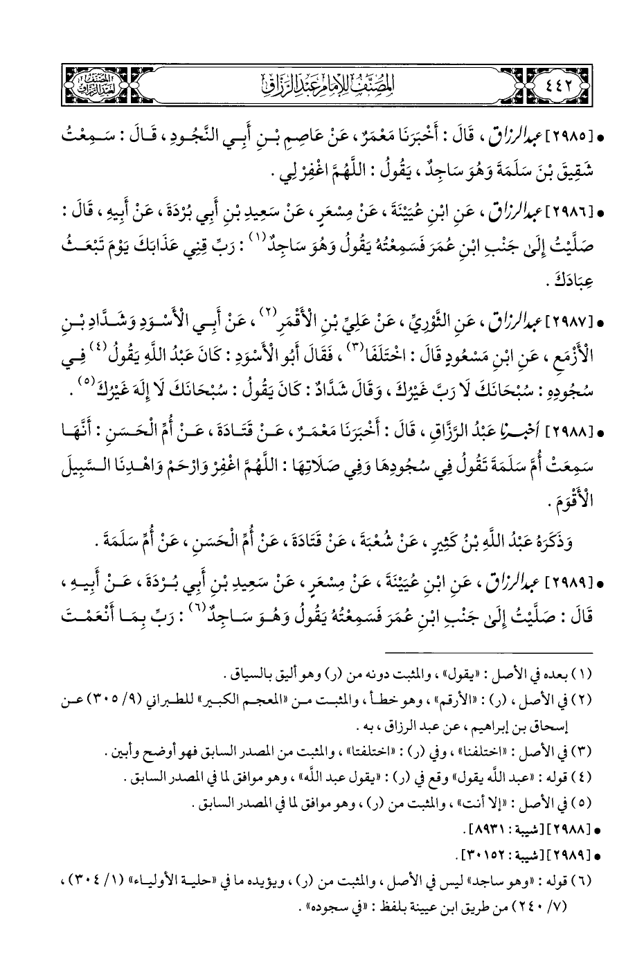 • [٢٩٨٩] عبد الرزاق، عَنِ ابْنِ عُيَيْنَةَ، عَنْ مِسْعَر، عَنْ سَعِيدِ بْنِ أَبِي بُرْدَةَ، عَنْ أَبِيهِ، قَالَ: صَلَّيْتُ إِلَى جَنْبِ ابْنِ عُمَرَ فَسَمِعْتُهُ يَقُولُ وَهُوَ سَاجِدٌ (¬٦): رَبِّ بِمَا أَنْعَمْتَ