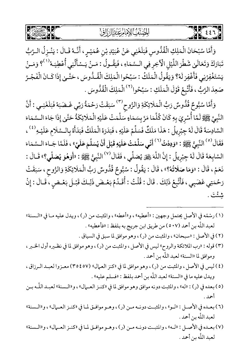وَأَمَّا سُبْحَانَ الْمَلِكِ الْقُدُّوسِ فَبَلَغَنِي عَنْ عُبَيْدِ بْنِ عُمَيْرٍ، أَنَّهُ قَالَ: يَنْزِلُ الرَّبُّ تَبَارَكَ وَتَعَالَى شَطْرَ اللَّيْلِ الْآخِرِ فِي السَّمَاءَ، فَيقُولُ: مَنْ يَسْأَلُنِي أُعْطِيَهُ (¬١)؟ وَمَنْ يَسْتَغْفِرُنِي فَأَغْفِرَ لَهُ؟ وَيَقُولُ الْمَلَكُ: سَبِّحُوا الْمَلِكَ الْقُدُّوسَ، حَتَّى إِذَا كَانَ الْفَجْرُ صَعِدَ الرَّبُّ، فَأتَّبعُ قَوْلَ الْمَلَكِ: سَبِّحُوا (¬٢) الْمَلِكَ الْقُدُّوسَ.