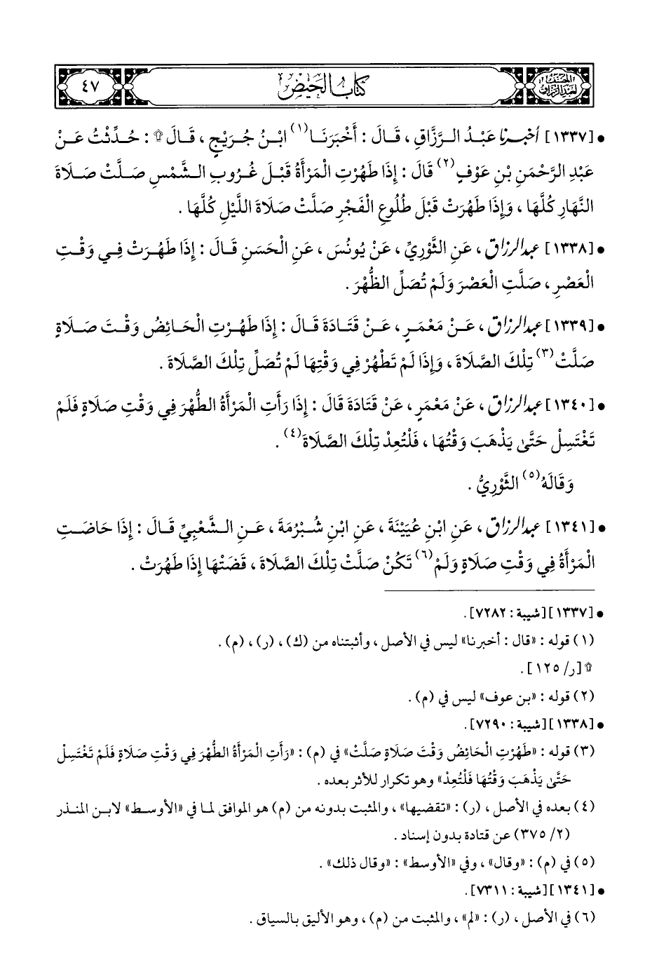 • [١٣٣٧] أَخْبَرَنَا عَبْدُ الرَّزَّاقِ، قَالَ: أَخْبَرَنَا (¬١) ابْنُ جُرَيْجٍ، قَالَ *: حُدِّثْتُ عَنْ عَبْدِ الرَّحْمَنِ بْنِ عَوْفٍ (¬٢) قَالَ: إِذَا طَهُرْتِ الْمَرْأَةُ قَبْلَ غُرُوبِ الشَّمْسِ صَلَّتْ صَلَاةَ النَّهَارِ كُلَّهَا، وإذَا طَهُرَتْ قَبْلَ طُلُوعِ الْفَجْرِ صَلَّتْ صلَاةَ اللَّيْلِ كُلَّهَا.