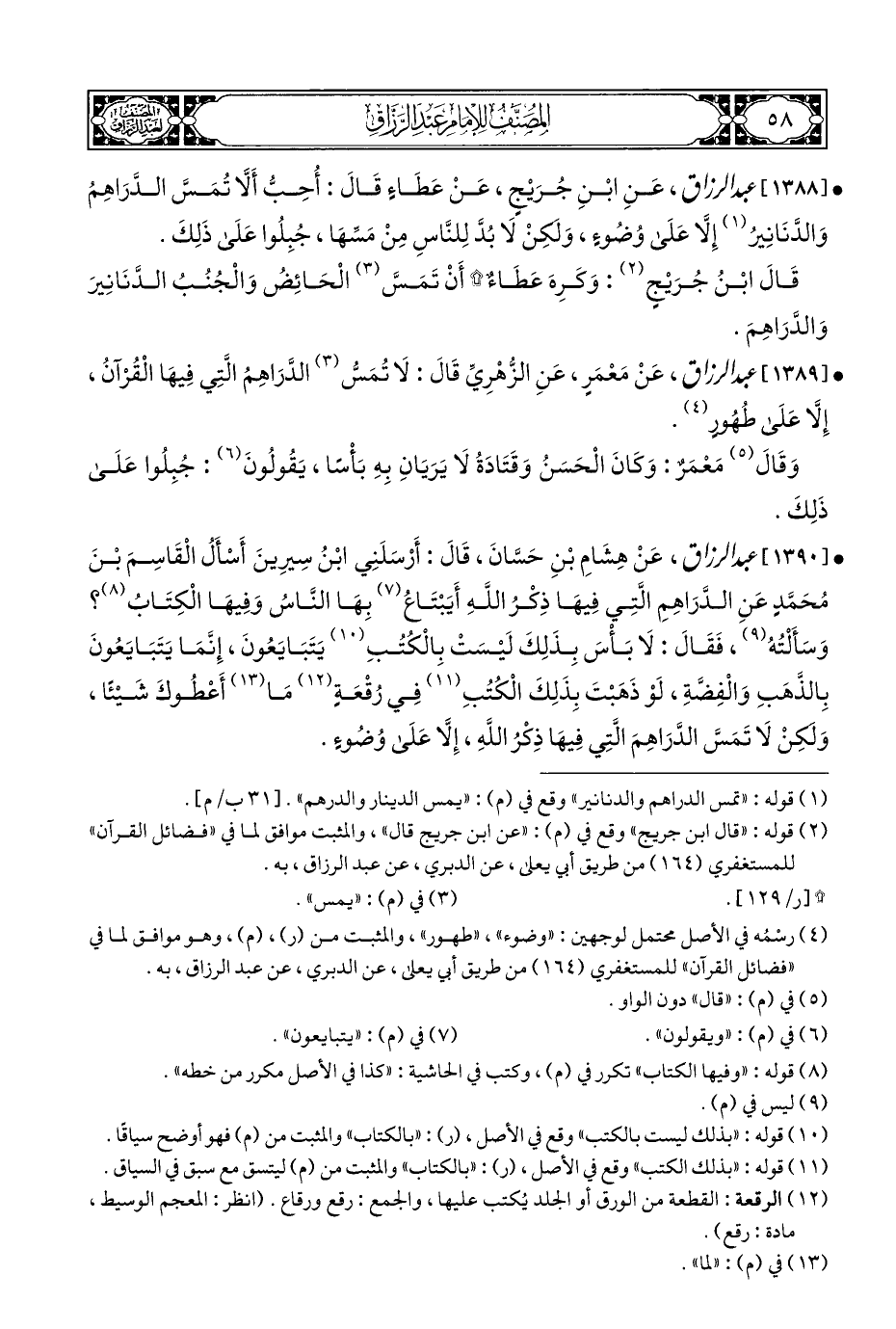 • [١٣٨٩] عبد الرزاق، عَنْ مَعْمَرٍ، عَنِ الزُّهْرِيِّ قَالَ: لَا تُمَسُّ (¬٣) الدَّرَاهِمُ الَّتِي فِيهَا الْقُرْآنُ، إِلَّا عَلَى طُهُورٍ (¬٤).