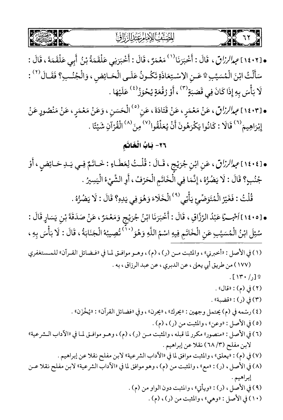 • [١٤٠٥] أَخْبَرَنَا عَبْدُ الرَّزَّاقِ، قَالَ: أَخْبَرَنَا ابْنُ جُرَيْجٍ وَمَعْمَرٌ، عَنْ صدَقَةَ بْنِ يَسَارٍ قَالَ: سُئِلَ ابْنُ الْمُسَيَّبِ عَنِ الْخَاتَمِ فِيهِ اسْمُ اللَّهِ وَهُوَ (¬١٠) تُصِيبُهُ الْجَنَابَةُ، قَالَ: لَا بَأْسَ بِهِ،