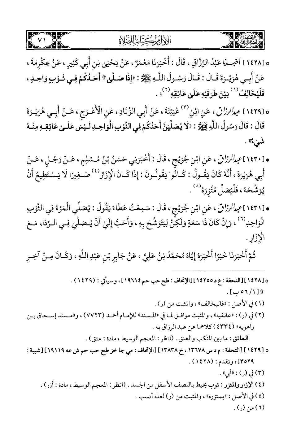 ° [١٤٢٩] عبد الرزاق، عَنِ ابْنِ (¬٣) عُيَيْنَةَ، عَنْ أبِي الزِّنَادِ، عَنِ الْأَعْرَجِ، عَنْ أَبِي هُرَيْرَةَ قَالَ: قَالَ رَسُولُ اللَّهِ - صلى الله عليه وسلم -: "لَا يُصَلِّيَنَّ أَحَدُكُمْ فِي الثوْبِ الْوَاحِدِ لَيْسَ عَلَى عَاتِقِهِ مِنْهُ شَيْءٌ".