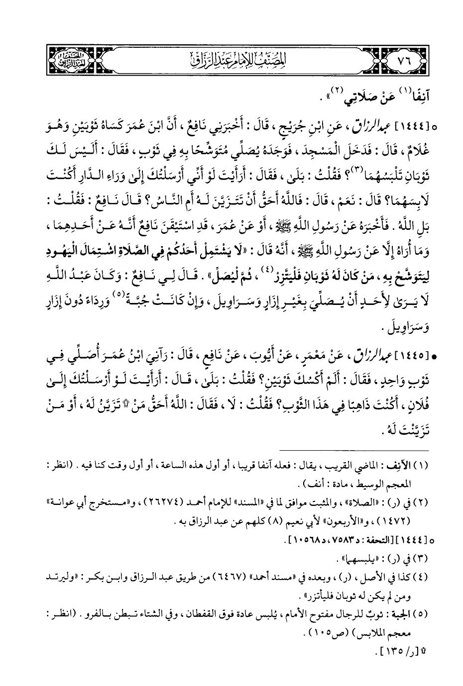 ° [١٤٤٤] عبد الرزاق، عَنِ ابْنِ جُرَيْجٍ، قَالَ: أَخْبَرَنِي نَافِعٌ، أَنَّ ابْنَ عُمَرَ كَسَاهُ ثَوْبَيْنِ وَهُوَ غُلَامٌ، قَالَ: فَدَخَلَ الْمَسْجِدَ، فَوَجَدَهُ يُصَلِّي مُتَوَشِّحًا بِهِ فِي ثَوْبٍ، فَقَالَ: أَلَيْسَ لَكَ ثَوْبَانِ تَلْبَسُهُمَا (¬٣)؟ فَقُلْتُ: بَلَى، فَقَالَ: أَرَأَيْتَ لَوْ أَنِّي أَرْسَلْتُكَ إِلَى وَرَاءِ الدَّارِ أَكُنْتَ لَابِسَهُمَا؟ قَالَ: نَعَمْ، قَالَ: فَاللَّهُ أَحَقُّ أَنْ تَتَزَيَّنَ لَهُ أَمِ النَّاسُ؟ قَالَ نَافِعٌ: فَقُلْتُ: بَلِ اللَّهُ. فَأَخْبَرَهُ عَنْ رَسُولِ اللَّهِ - صلى الله عليه وسلم -، أَوْ عَنْ عُمَرَ، قَدِ اسْتَيْقَنَ نَافِعٌ أَنَّهُ عَنْ أَحَدِهِمَا، وَمَا أُرَاهُ إِلَّا عَنْ رَسُولِ اللَّهِ - صلى الله عليه وسلم -، أَنَّهُ قَالَ: "لَا يَشْتَمِلْ أَحَدُكُمْ فِي الصَّلَاةِ اشْتِمَالَ الْيَهُودِ ليَتَوَشَّحْ بِهِ، مَنْ كَانَ لَهُ ثَوْبَانِ فَلْيَتَّزِرْ (¬٤)، ثُمَّ لْيُصَلِّ". قَالَ لِي نَافِعٌ: وَكَانَ عَبْدُ اللهِ لَا يَرَى لِأَحَدٍ أَنْ يُصَلِّيَ بِغَيْرِ إِزَارٍ وَسَرَاوِيلَ، وَإِنْ كَانَتْ جُبَّةً (¬٥) وَرِدَاءَ دُونَ إِزَارٍ وَسَرَاوِيلَ.