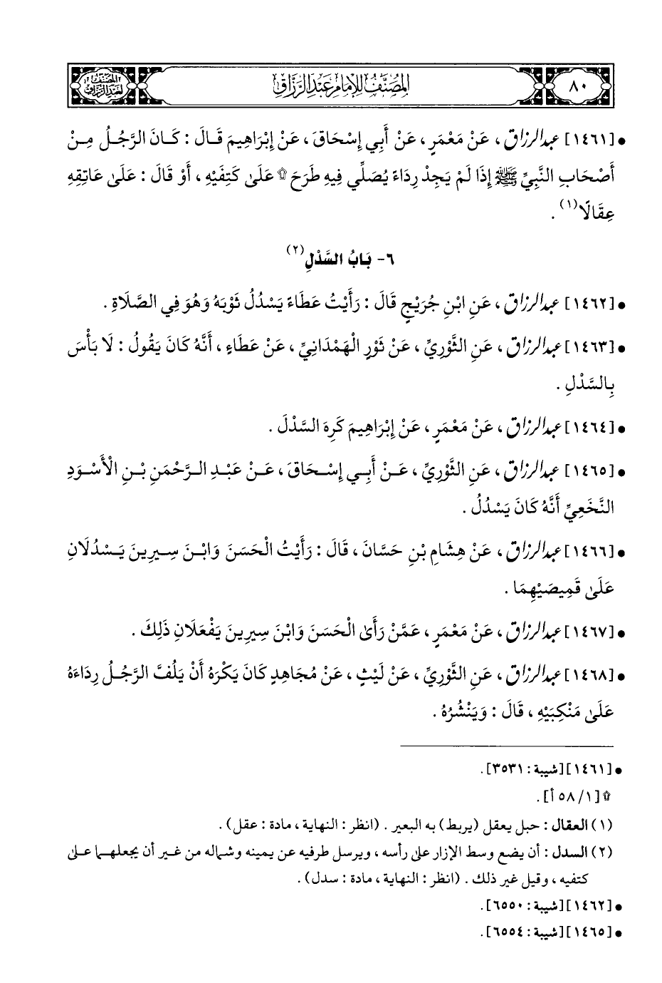 • [١٤٦١] عبد الرزاق، عَنْ مَعْمَرٍ، عَنْ أَبِي إِسْحَاقَ، عَنْ إِبْرَاهِيمَ قَالَ: كَانَ الرَّجُلُ مِنْ أَصْحَابِ النَّبِيِّ - صلى الله عليه وسلم - إِذَا لَمْ يَجِدْ رِدَاءَ يُصَلِّي فِيهِ طَرَحَ* عَلَى كَتِفَيْهِ، أَوْ قَالَ: عَلَى عَاتِقِهِ عِقَالًا (¬١).