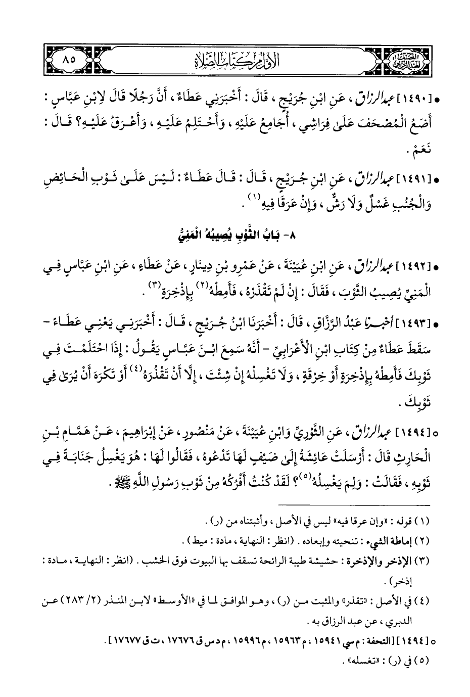 • [١٤٩٣] أَخبَرَنَا عَبْدُ الرَّزَّاقِ، قَالَ: أَخبَرَنَا ابْنُ جُرَيْجٍ، قَالَ: أَخْبَرَنِي يَعْنِي عَطَاءً - سَقَطَ عَطَاءٌ مِنْ كِتَابِ ابْنِ الْأَعْرَابِيِّ - أَنَّهُ سَمِعَ ابْنَ عَبَّاسٍ يَقُولُ: إِذَا احْتَلَمْتَ فِي ثَوْبِكَ فَأَمِطْهُ بِإِذْخِرَةٍ أَوْ خِرْقَةٍ، وَلَا تَغْسِلْهُ إِنْ شِئتَ، إِلَّا أَنْ تَقْذُرَهُ (¬٤) أَوْ تَكْرَهَ أَنْ يُرَى فِي ثَوْبِكَ.