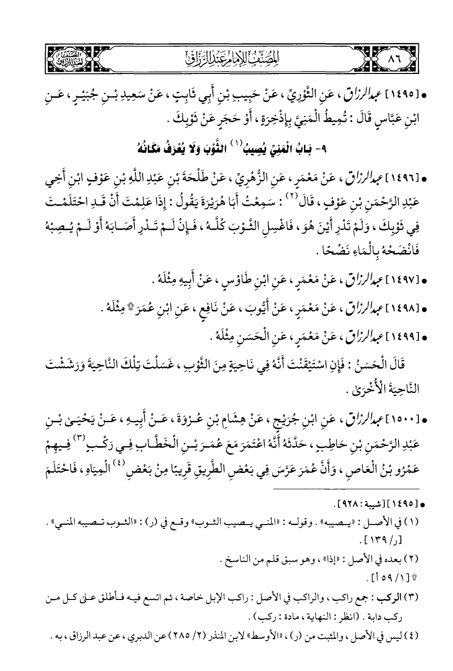 • [١٥٠٠] عبد الرزاق، عَنِ ابْنِ جُرَيْجٍ، عَنْ هِشَامِ بْنِ عُرْوَةَ، عَنْ أَبِيهِ، عَنْ يَحْيَى بْنِ عَبْدِ الرَّحْمَنِ بْنِ حَاطِبٍ، حَدَّثَهُ أَنهُ اعْتَمَرَ مَعَ عُمَرَ بْنِ الْخَطَّابِ فِي رَكْبٍ (¬٣) فِيهِمْ عَمْرُو بْنُ الْعَاصِ، وَأَنَّ عُمَرَ عَرَّسَ فِي بَعْضِ الطَّرِيقِ قَرِيبًا مِنْ بَعْضِ (¬٤) الْمِيَاهِ، فَاحْتَلَمَ