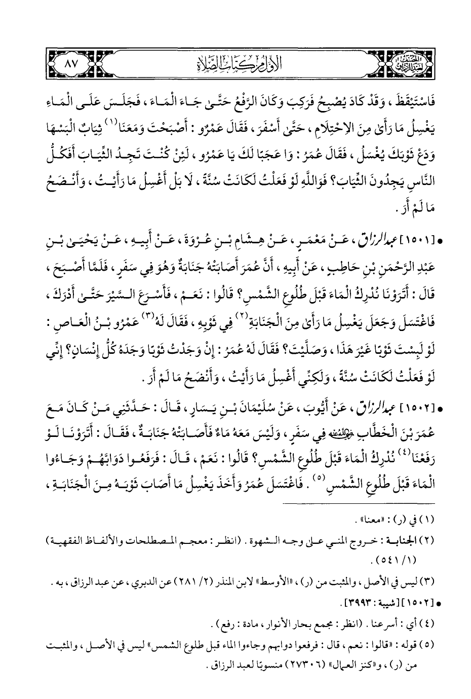 • [١٥٠١] عبد الرزاق، عَنْ مَعْمَرٍ، عَنْ هِشَامِ بْنِ عُرْوَةَ، عَنْ أَبِيهِ، عَنْ يَحْيَى بْنِ عَبْدِ الرَّحْمَنِ بْنِ حَاطِبٍ، عَنْ أبِيهِ، أَنَّ عُمَرَ أَصَابَتْهُ جَنَابَةٌ وَهُوَ فِي سَفَرٍ، فَلَمَّا أَصْبَحَ، قَالَ: أَتَرَوْنَا نُدْرِكُ الْمَاءَ قَبْلَ طُلُوعِ الشَّمْسِ؟ قَالُوا: نَعَمْ، فَأَسْرَعَ السَّيْرَ حَتَّى أَدْرَكَ، فَاغْتَسَلَ وَجَعَلَ يَغْسِلُ مَا رَأَى مِنَ الْجَنَابَةِ (¬٢) فِي ثَوْبِهِ، فَقَالَ لَهُ (¬٣) عَمْرُو بْنُ الْعَاصِ: لَوْ لَبِسْتَ ثَوْبًا غَيْرَ هَذَا، وَصَلَّيْتَ؟ فَقَالَ لَهُ عُمَرُ: إِنْ وَجَدْتُ ثَوْبًا وَجَدَهُ كُلُّ إِنْسَانٍ؟ إِنِّي لَوْ فَعَلْتُ لكَانَتْ سُنَّةً، وَلكِنِّي أَغْسِلُ مَا رَأَيْتُ، وَأَنْضَحُ مَا لَمْ أَرَ.