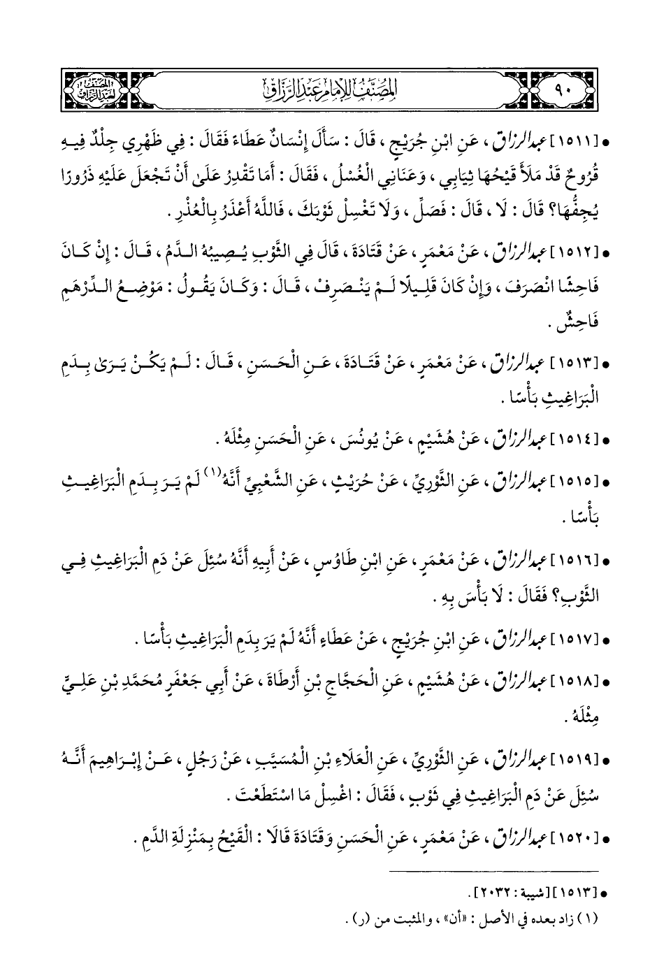 • [١٥١٥] عبد الرزاق، عَنِ الثَّوْريِّ، عَنْ حُرَيْثٍ، عَنِ الشَّعْبِيِّ أَنَّهُ (¬١) لَمْ يَرَ بِدَمِ الْبَرَاغِيثِ بَأْسًا.