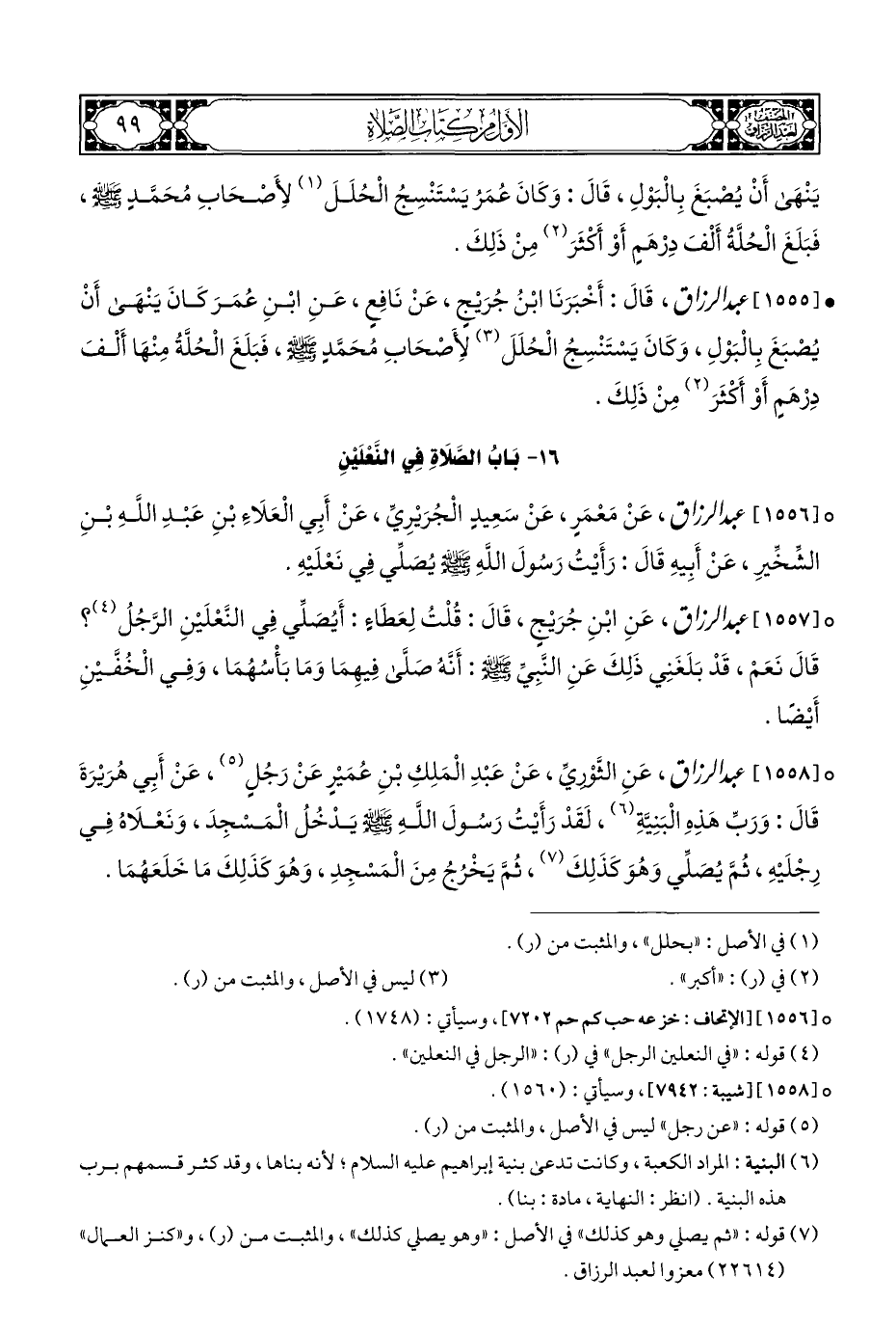° [١٥٥٦] عبد الرزاق، عَنْ مَعْمَرٍ، عَنْ سَعِيدٍ الْجُرَيْرِيِّ، عَنْ أَبِي الْعَلَاءَ بْنِ عَبْدِ اللَّهِ بْنِ الشِّخِّيرِ، عَنْ أَبِيهِ قَالَ: رَأَيْتُ رَسُولَ اللَّهِ - صلى الله عليه وسلم - يُصَلِّي فِي نَعْلَيْهِ.