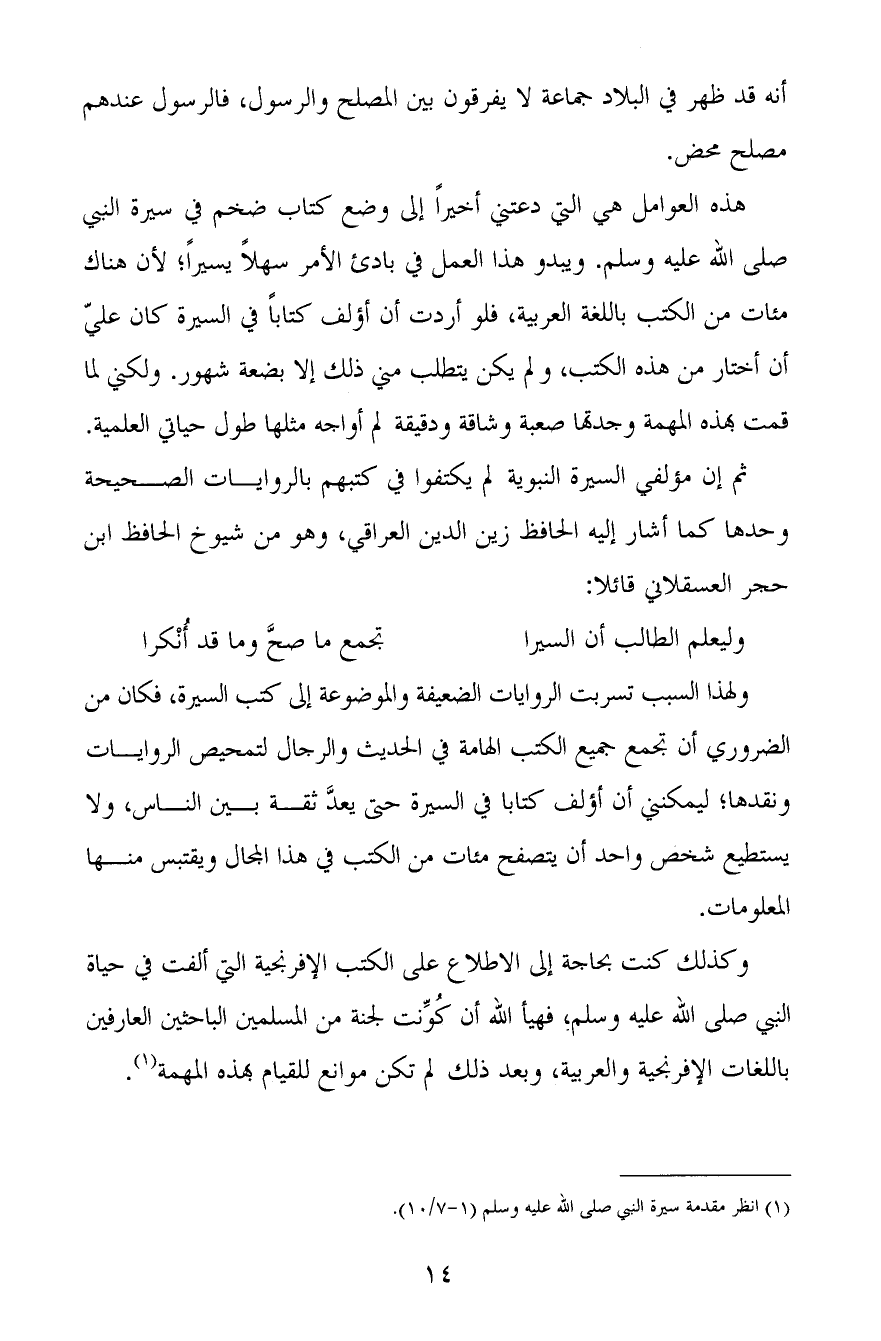ولهذا السبب تسربت الروايات الضعيفة والموضوعة إلى كتب السيرة، فكان من الضروري أن تجمع جميع الكتب الهامة في الحديث والرجال لتمحيص الروايات ونقدها؛ ليمكنني أن أؤلف كتابا في السيرة حتى يعدَّ ثقة بين الناس، ولا يستطيع شخص واحد أن يتصفح مئات من الكتب في هذا المجال ويقتبس منها المعلومات.