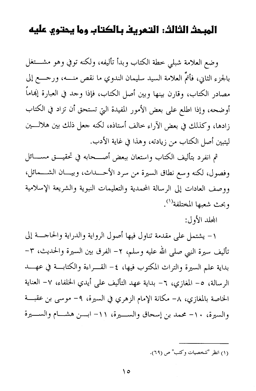 ثم انفرد بتأليف الكتاب واستعان ببعض أصحابه في تحقيق مسائل وفصول، لكنه وسع نطاق السيرة من سرد الأحداث، وبيان الشمائل، ووصف العادات إلى الرسالة المحمدية والتعليمات النبوية والشريعة الإسلامية وبحث شعبها المختلفة (1) .