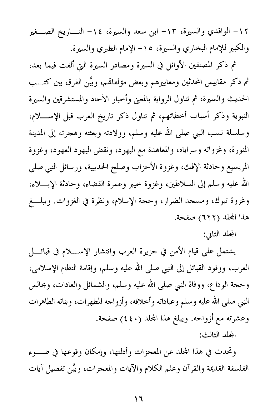 12- الواقدي والسيرة، 13- ابن سعد والسيرة، 14- التاريخ الصغير والكبير للإمام البخاري والسيرة، 15- الإمام الطبري والسيرة.