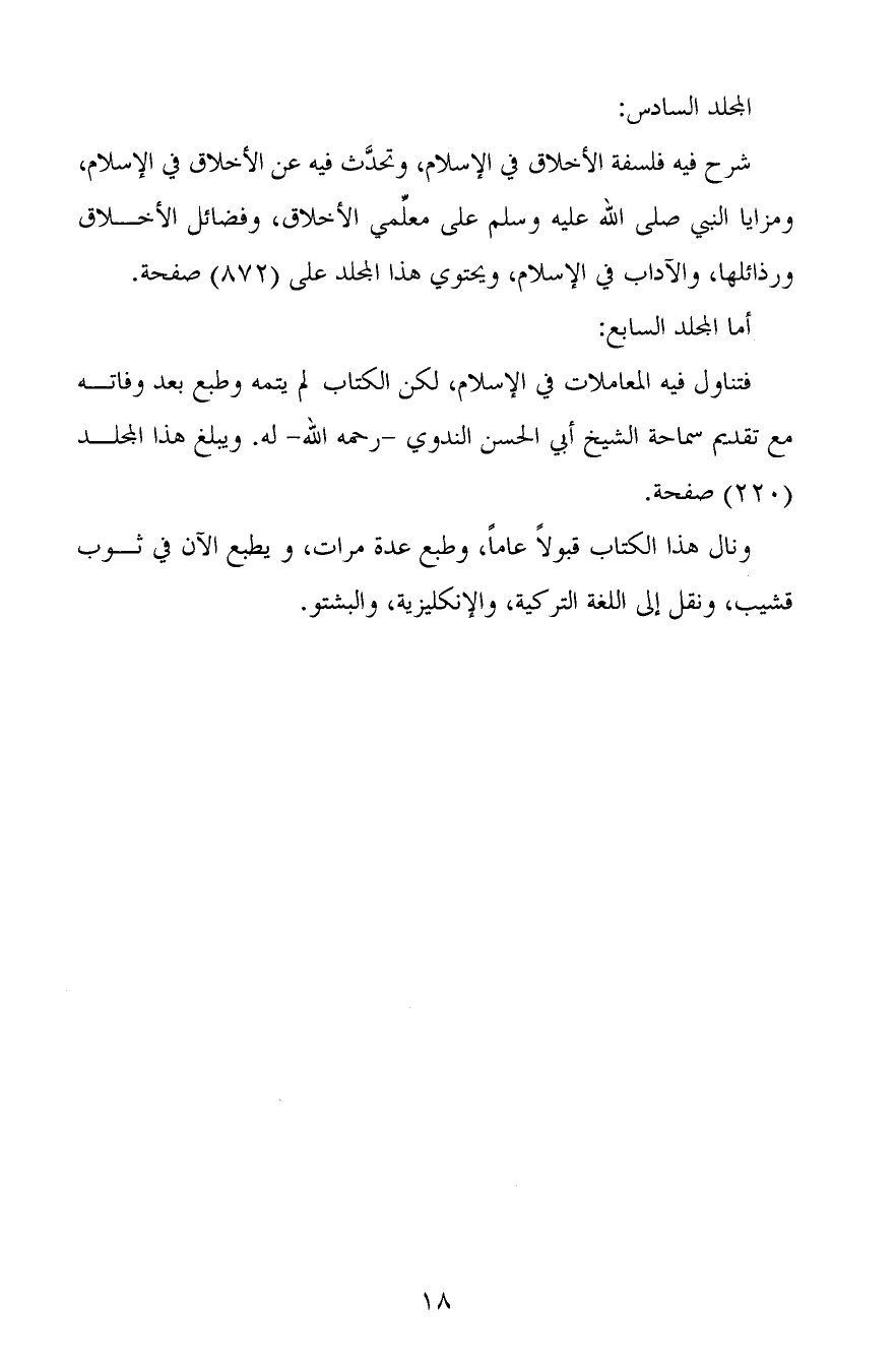 شرح فيه فلسفة الأخلاق في الإسلام، وتحدَّث فيه عن الأخلاق في الإسلام، ومزايا النبي صلى الله عليه وسلم على معلِّمي الأخلاق، وفضائل الأخلاق ورذائلها، والآداب في الإسلام، ويحتوي هذا المجلد على (872) صفحة.