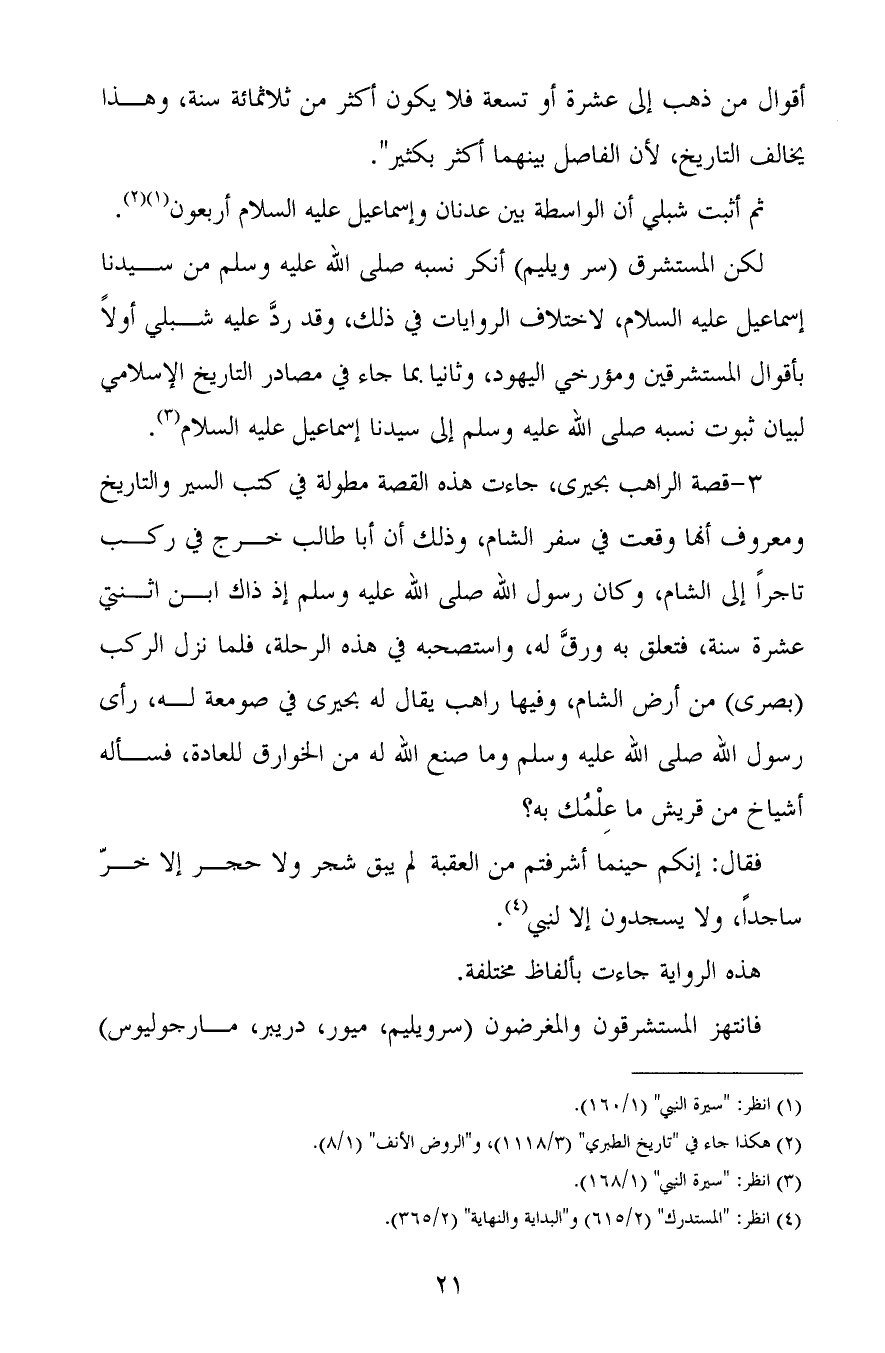 لكن المستشرق (سر ويليم) أنكر نسبه صلى الله عليه وسلم من سيدنا إسماعيل عليه السلام، لاختلاف الروايات في ذلك، وقد ردَّ عليه شبلي أولاً بأقوال المستشرقين ومؤرخي اليهود، وثانيا بما جاء في مصادر التاريخ الإسلامي لبيان ثبوت نسبه صلى الله عليه وسلم إلى سيدنا إسماعيل عليه السلام (3) .