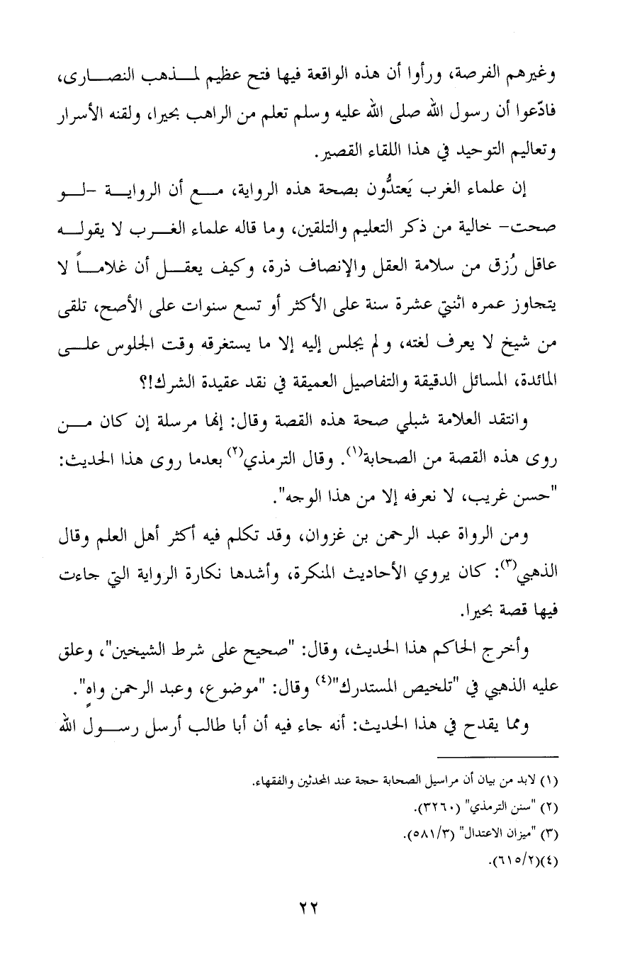 إن علماء الغرب يَعتدُّون بصحة هذه الرواية، مع أن الرواية -لو صحت- خالية من ذكر التعليم والتلقين، وما قاله علماء الغرب لا يقوله عاقل رُزق من سلامة العقل والإنصاف ذرة، وكيف يعقل أن غلاماً لا يتجاوز عمره اثنتي عشرة سنة على الأكثر أو تسع سنوات على الأصح، تلقى من شيخ لا يعرف لغته، ولم يجلس إليه إلا ما يستغرقه وقت الجلوس على المائدة، المسائل الدقيقة والتفاصيل العميقة في نقد عقيدة الشرك!؟