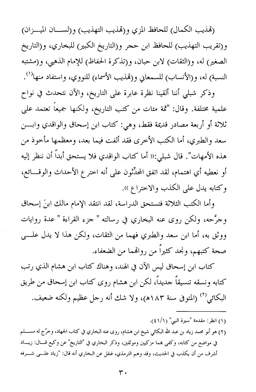كتاب ابن إسحاق ليس الآن في الهند، وهناك كتاب ابن هشام الذي رتب كتابه ونسقه تنسيقاً جديداً، لكن ابن هشام روى كتاب ابن إسحاق من طريق البكائي (2) (المتوفى سنة 183?) ، ولا شك أنه رجل عظيم ولكنه ضعيف.