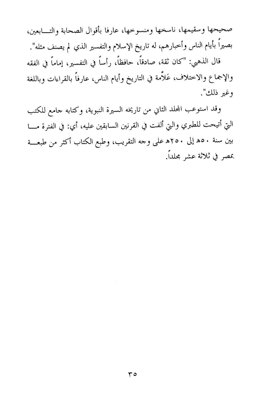 صحيحها وسقيمها، ناسخها ومنسوخها، عارفا بأقوال الصحابة والتابعين، بصيراً بأيام الناس وأخبارهم، له تاريخ الإسلام والتفسير الذي لم يصنف مثله".
